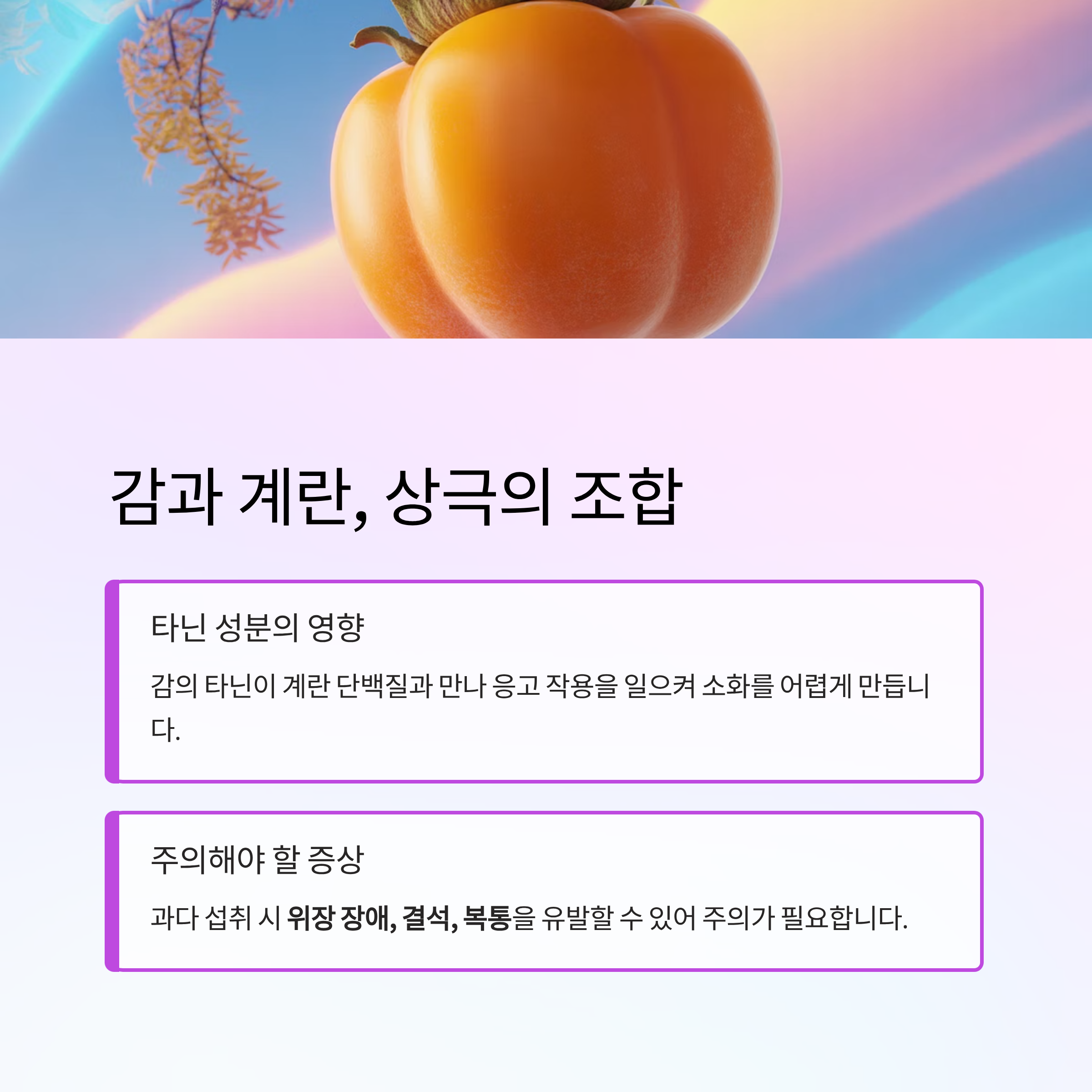감에는 타닌 성분이 풍부하게 들어 있습니다. 이 성분은 계란 속 단백질과 만나 응고 작용을 일으켜 위에서 소화를 어렵게 만들 수 있어요. 특히 감과 계란을 동시에 과다 섭취할 경우, 위장 장애나 결석, 복통을 유발할 수 있어 주의가 필요합니다.