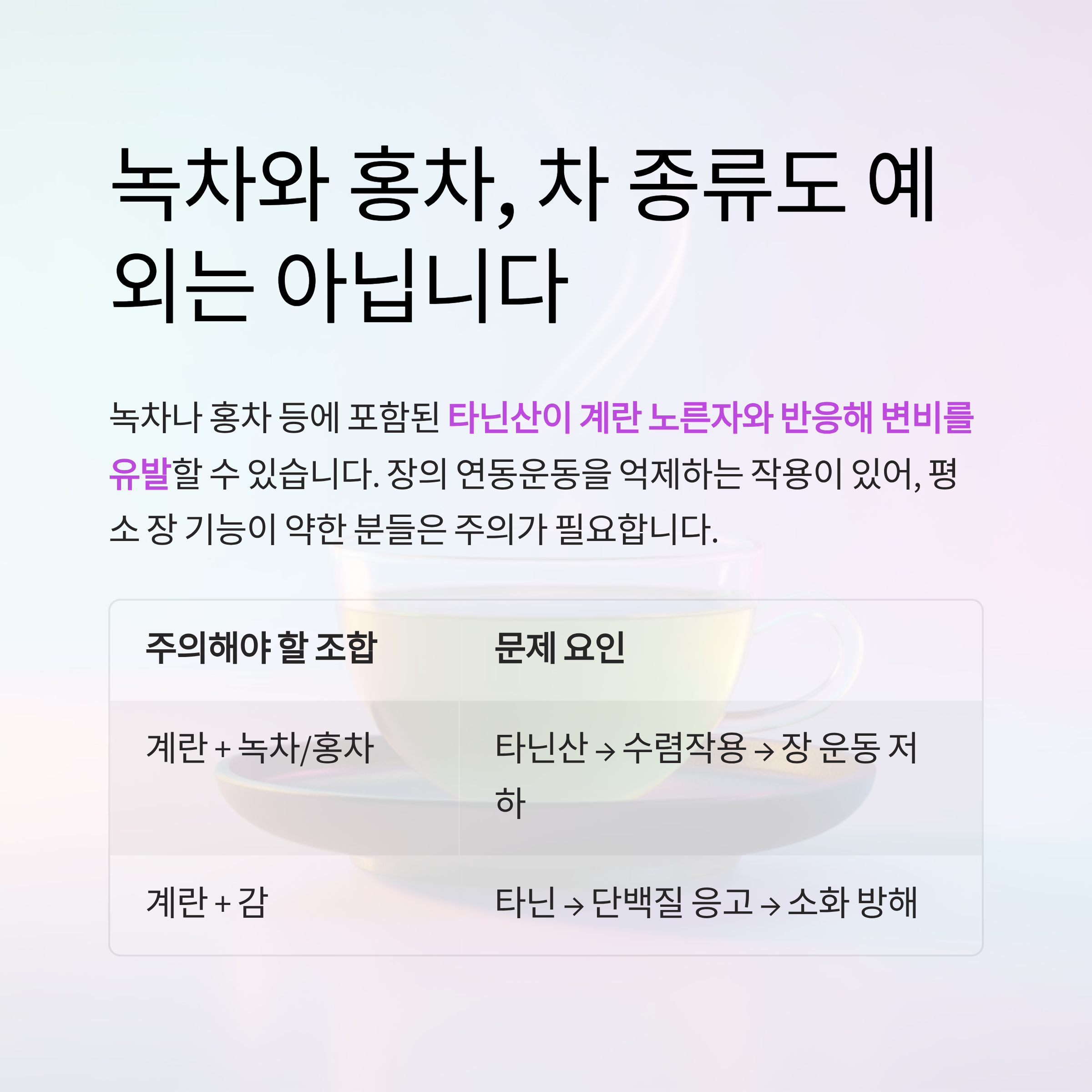| 계란 + 녹차/홍차 | 타닌산 → 수렴작용 → 장 운동 저하 |