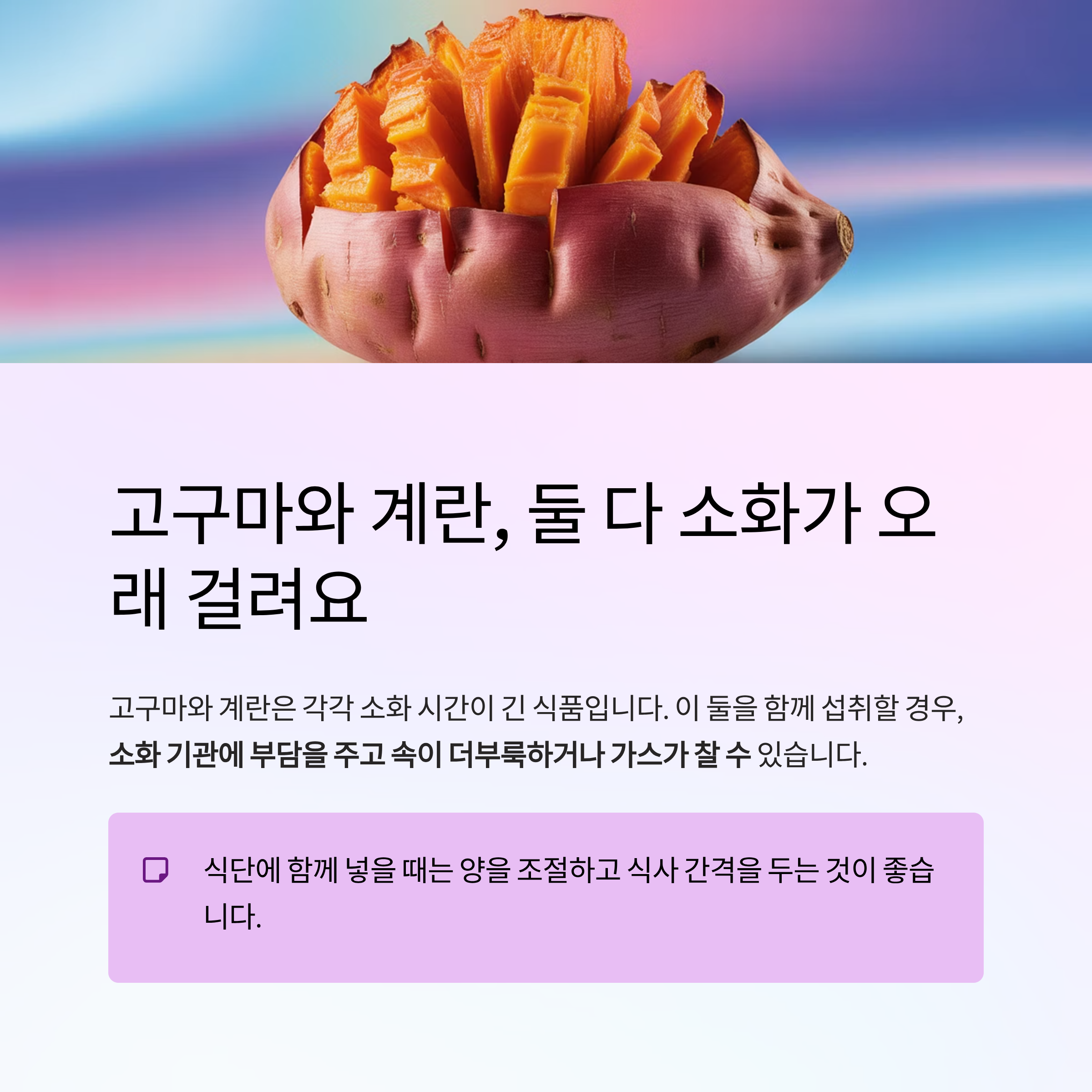 고구마와 계란은 각각 소화 시간이 긴 식품입니다. 이 둘을 함께 섭취할 경우, 소화 기관에 부담을 주고 속이 더부룩하거나 가스가 찰 수 있습니다. 식단에 함께 넣을 때는 양을 조절하고 식사 간격을 두는 것이 좋습니다.