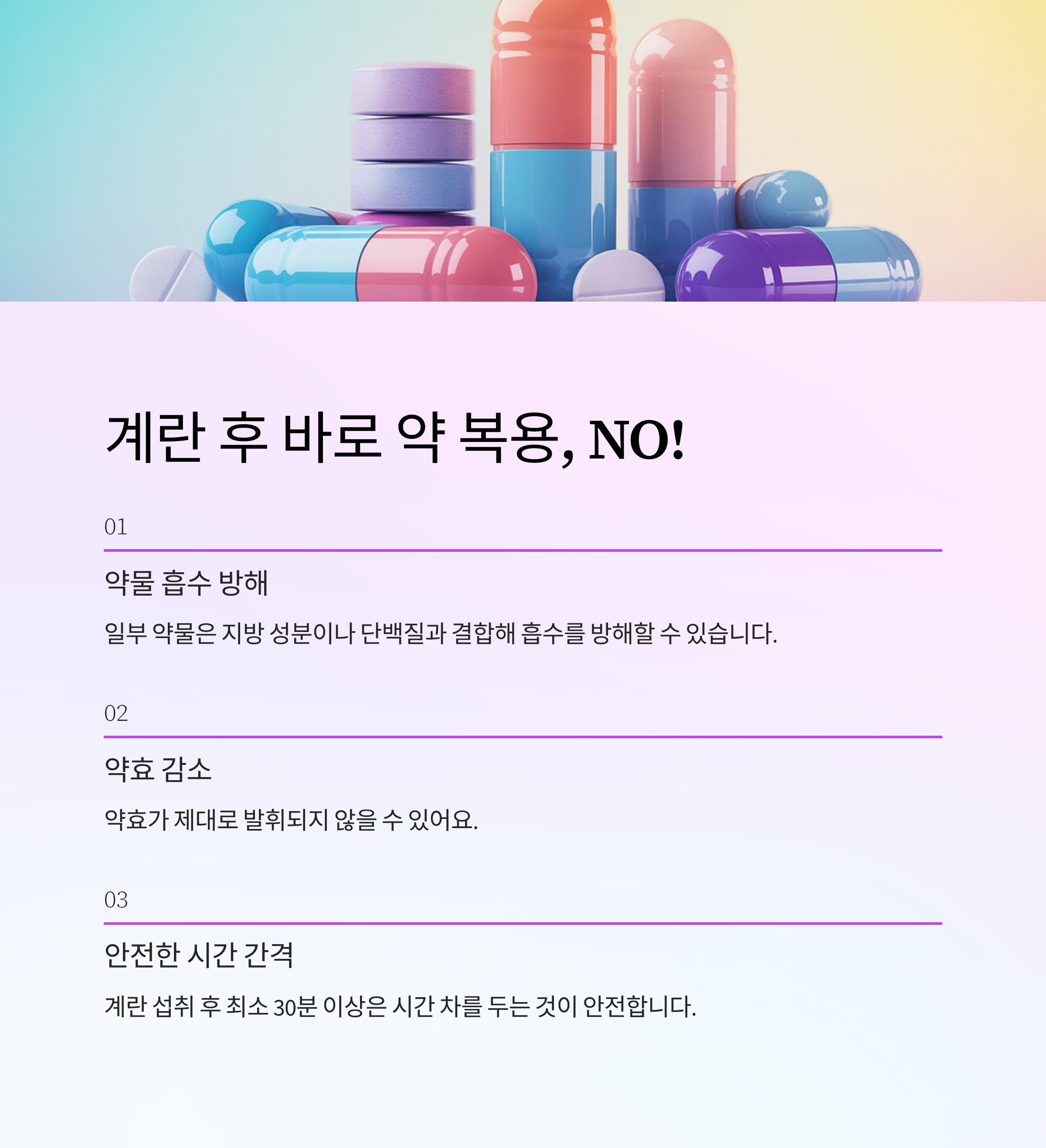 계란을 먹은 직후 약을 복용하는 것도 피해야 할 행동 중 하나입니다. 일부 약물은 지방 성분이나 단백질과 결합해 흡수를 방해할 수 있으며, 약효가 제대로 발휘되지 않을 수 있어요. 계란 섭취 후 최소 30분 이상은 시간 차를 두는 것이 안전합니다.