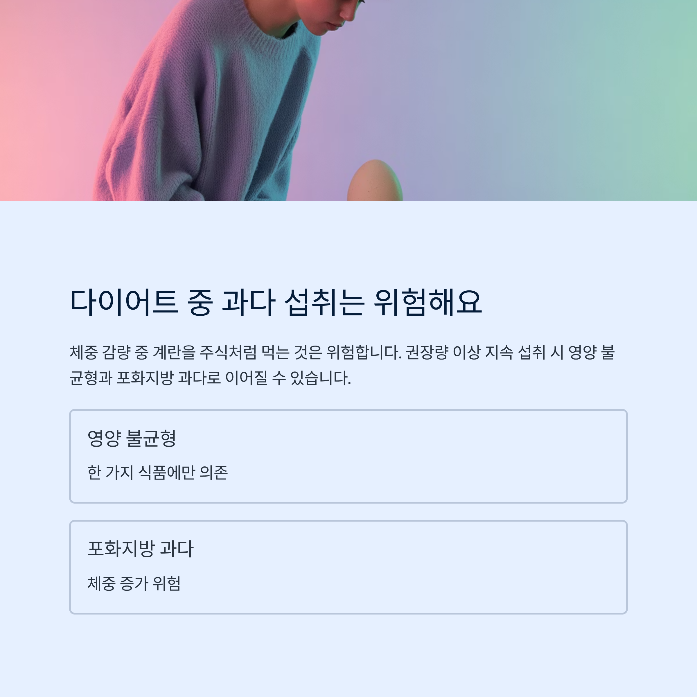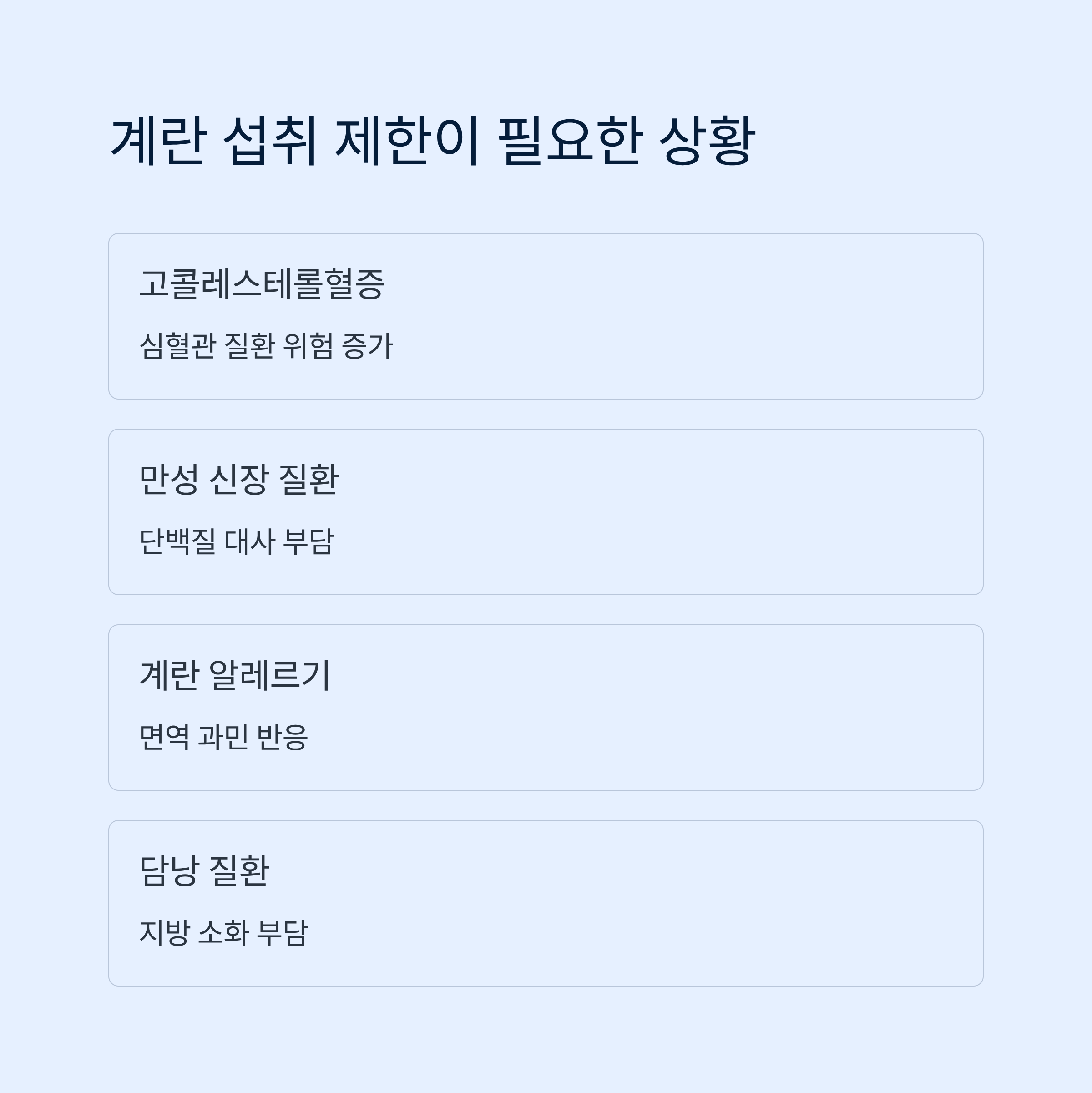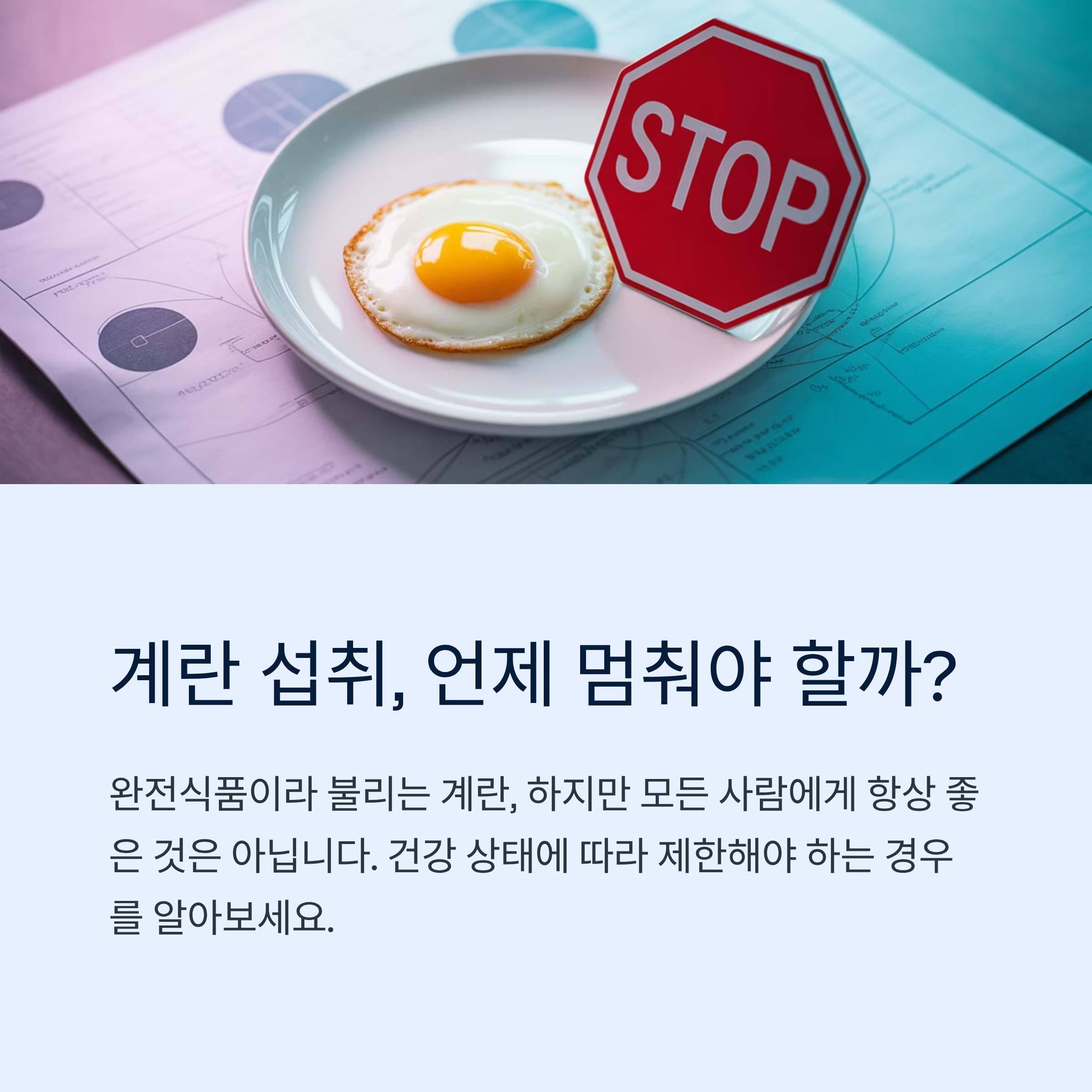 건강 상태나 질환, 생활 습관에 따라 계란 섭취를 제한하거나 중단해야 하는 상황이 있습니다.