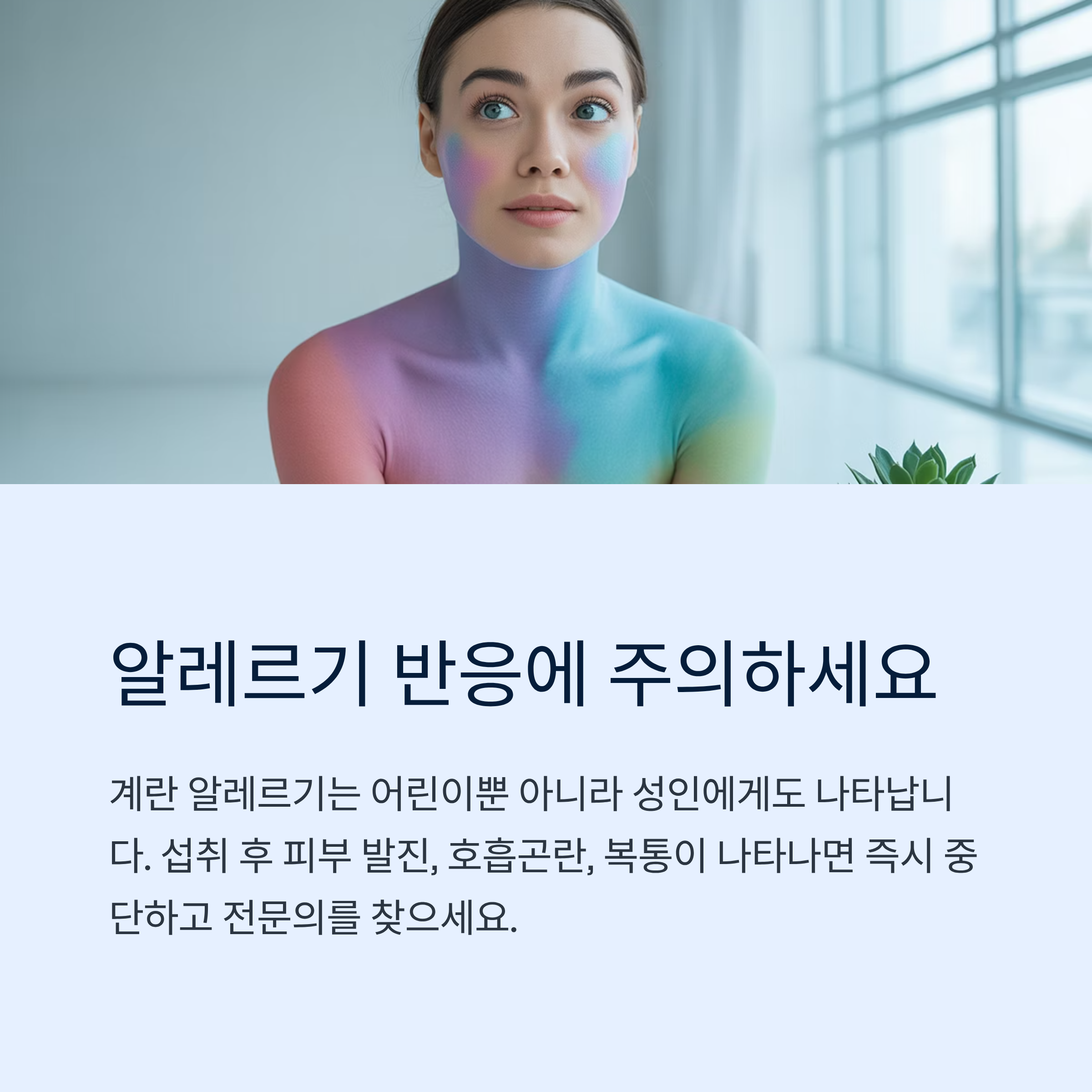 섭취 후 피부 발진, 호흡곤란, 복통이 나타난다면 즉시 섭취를 중단하고