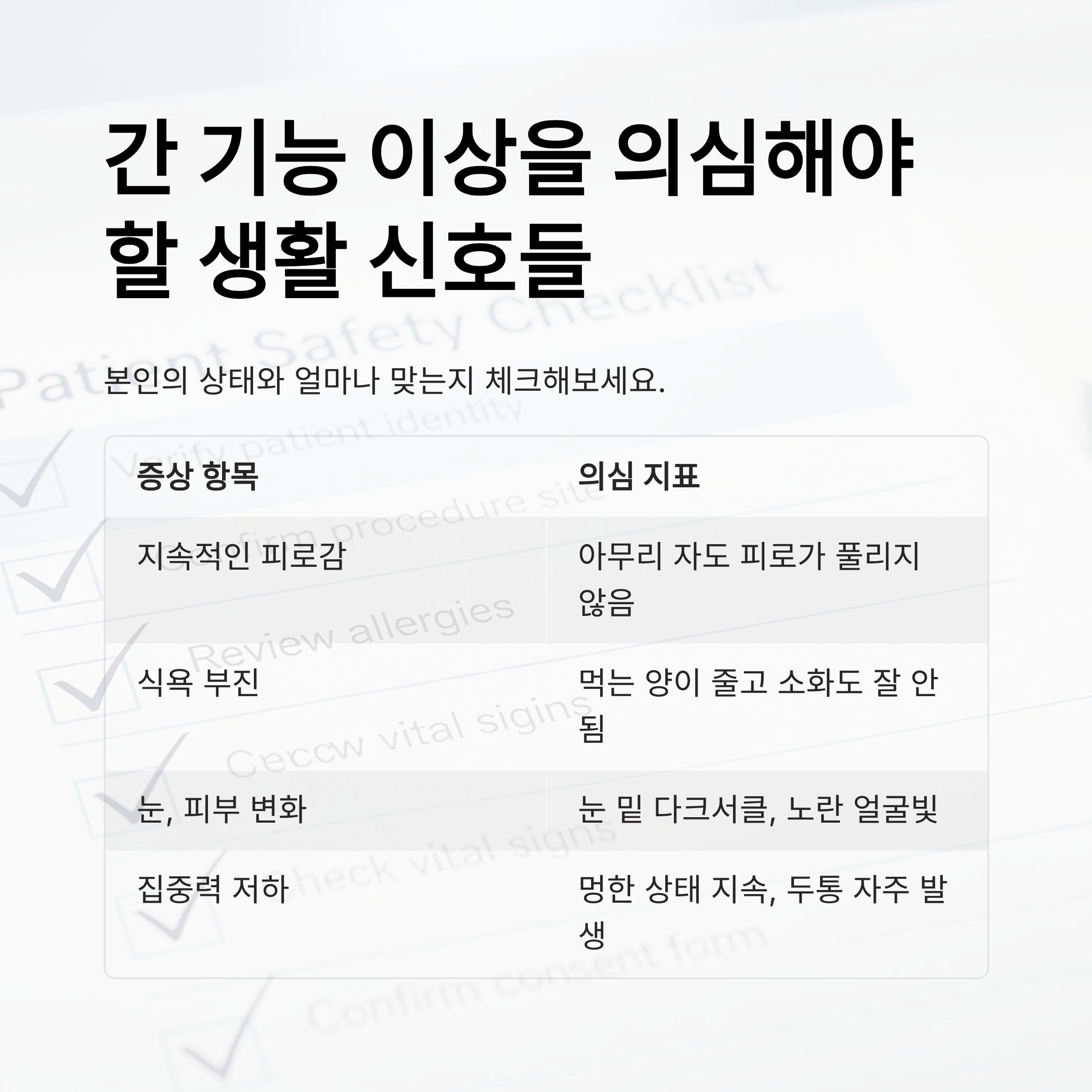 아래 표는 간 기능 저하를 의심할 수 있는 주요 증상들을 정리한 것입니다.