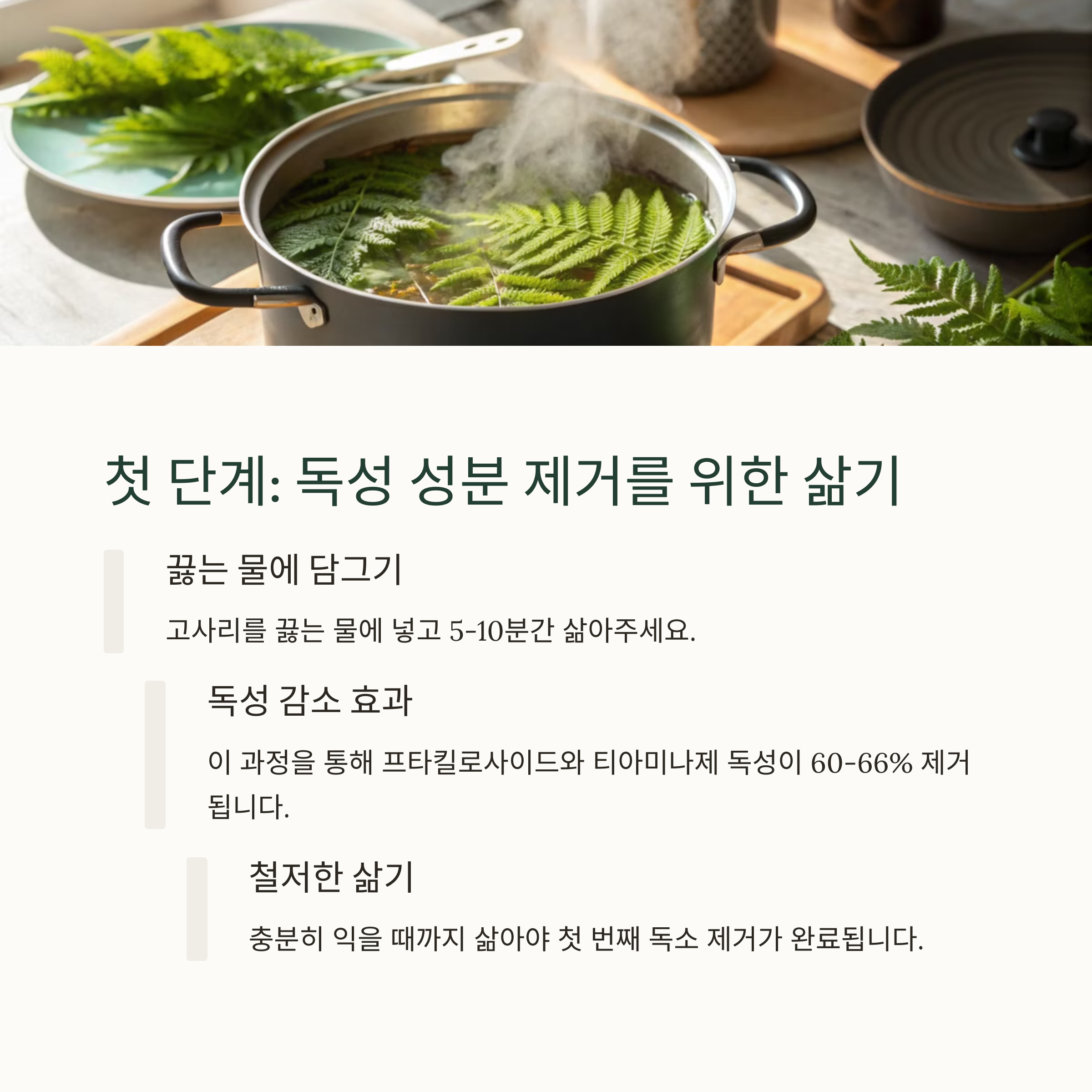 고사리를 안전하게 즐기기 위한 조리법은 생각보다 간단합니다. 두 단계만 잘 지키면 대부분의 독성 물질이 사라지거든요. 첫 번째로는 고사리를 끓는 물에 삶는 과정이 필요해요. 이때 소금을 살짝 넣어주면 독성 제거에 더 효과적입니다. 두 번째로는 삶은 고사리를 충분히 물에 담가 독성을 거의 완전히 없애는 단계죠.