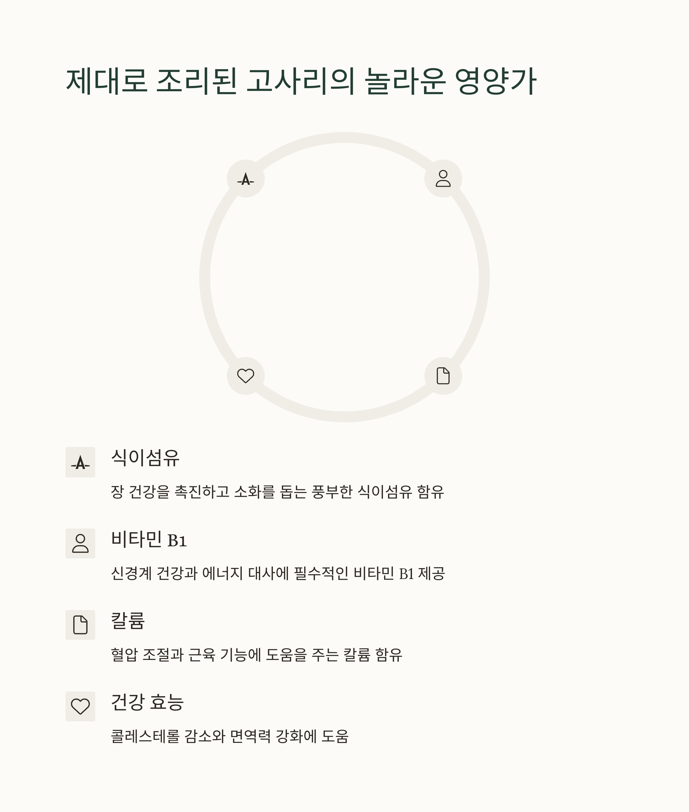 독성이 제거된 고사리는 건강에 정말 좋은 식재료로 거듭납니다! 풍부한 식이섬유 덕분에 장 건강을 돕고, 비타민 B1과 칼륨, 인 등의 미네랄이 우리 몸을 튼튼하게 해줘요. 고사리에는 항산화 성분도 풍부해서 면역력 강화와 콜레스테롤 감소에도 기여합니다.