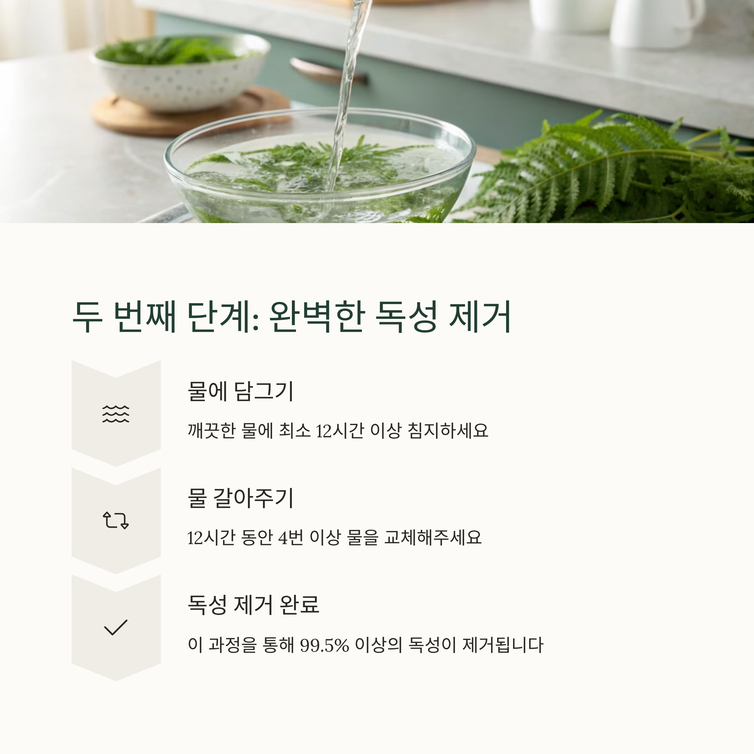 또 한 가지, 시중에서 판매하는 말린 고사리 역시 주의가 필요합니다. 말렸다고 독성이 없어진 건 아니라서 조리 과정이 필수입니다. 집에서 요리할 때는 꼭 두 단계를 지켜주세요. 아, 그리고 쌀뜨물에 담그면 잡내 제거와 독성 흡착에 도움 된다는 꿀팁도 잊지 마시고요!