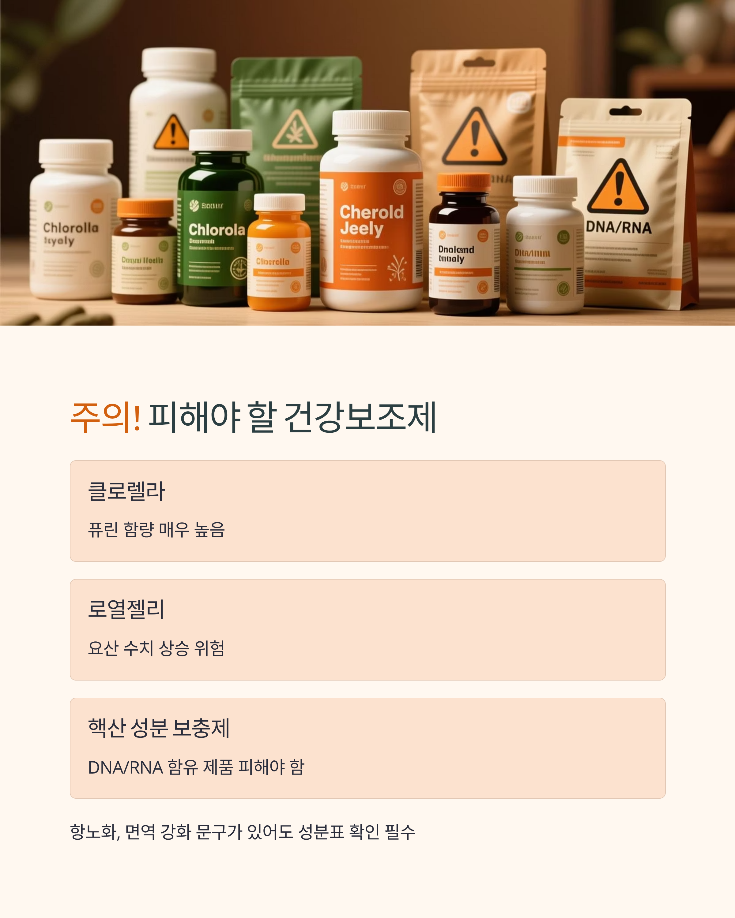 클로렐라, 로열젤리, 핵산(DNA/RNA) 성분 보충제는 퓨린이 매우 높아 반드시 피해야 합니다. 항노화, 면역 강화라는 문구가 있어도 성분표를 반드시 확인해야 합니다.