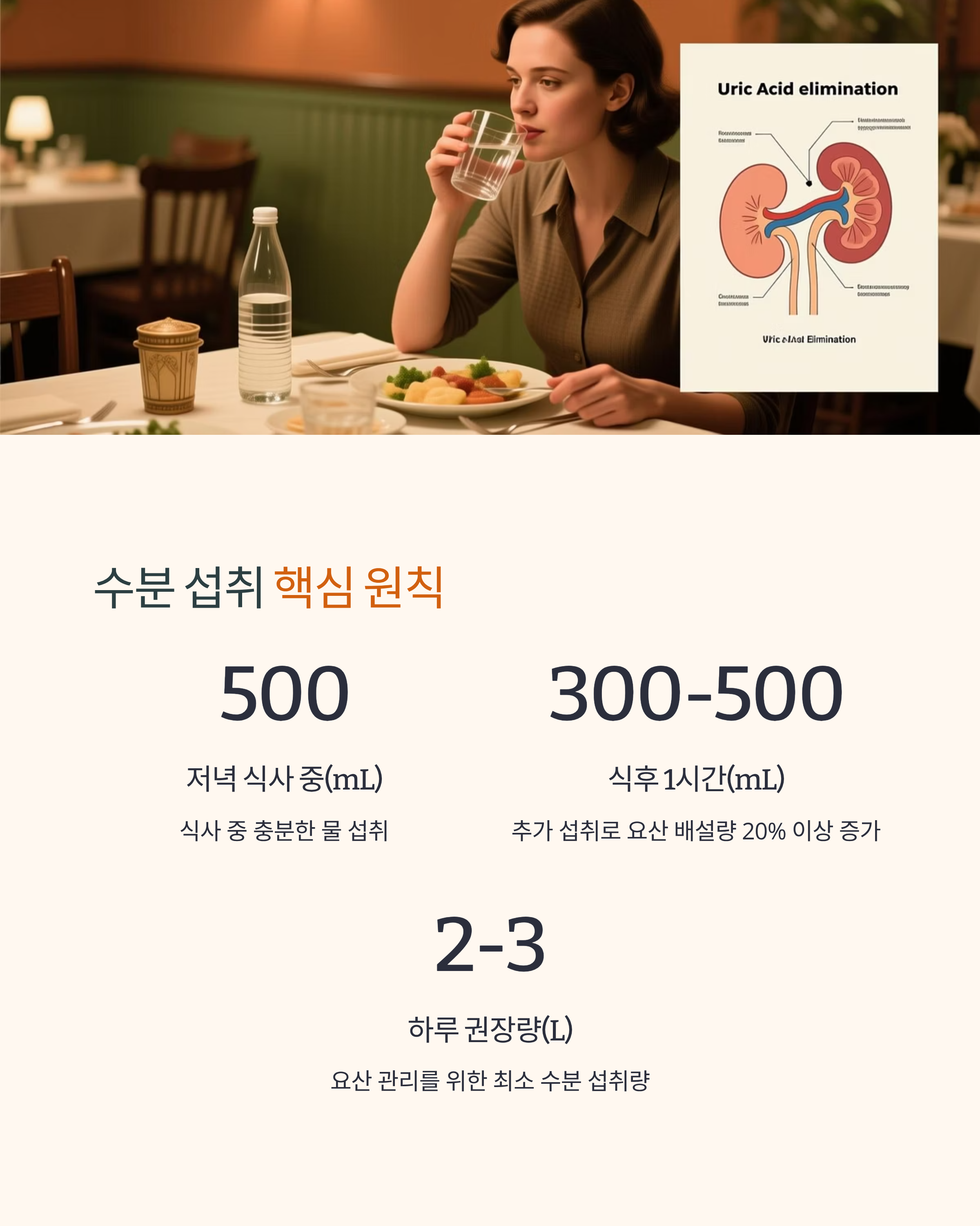 저녁 식사 중 500mL, 식후 1시간 이내 300mL~500mL를 추가 섭취하면 요산 배설량이 20% 이상 증가합니다. 하루 총 2L~3L 이상이 권장됩니다.