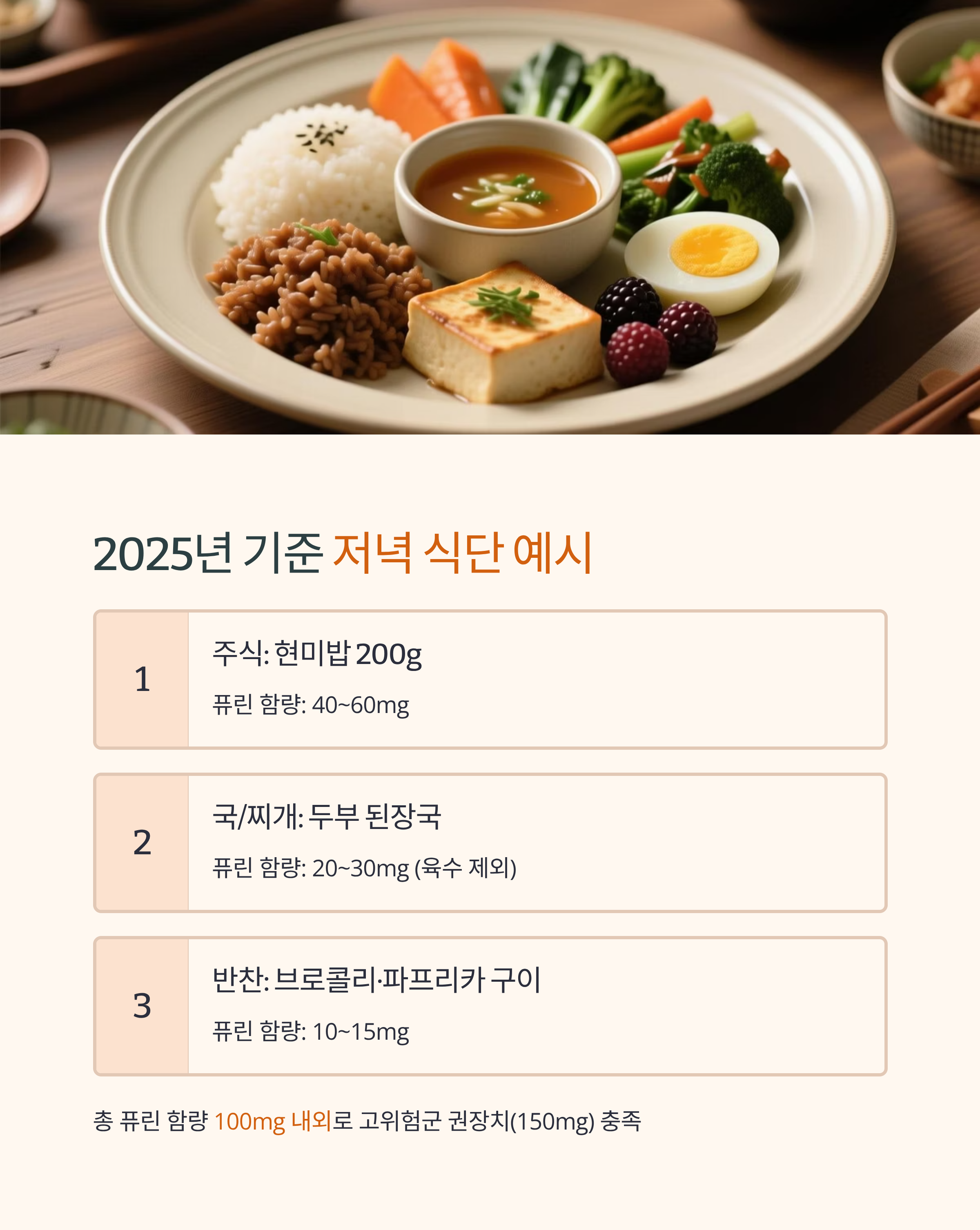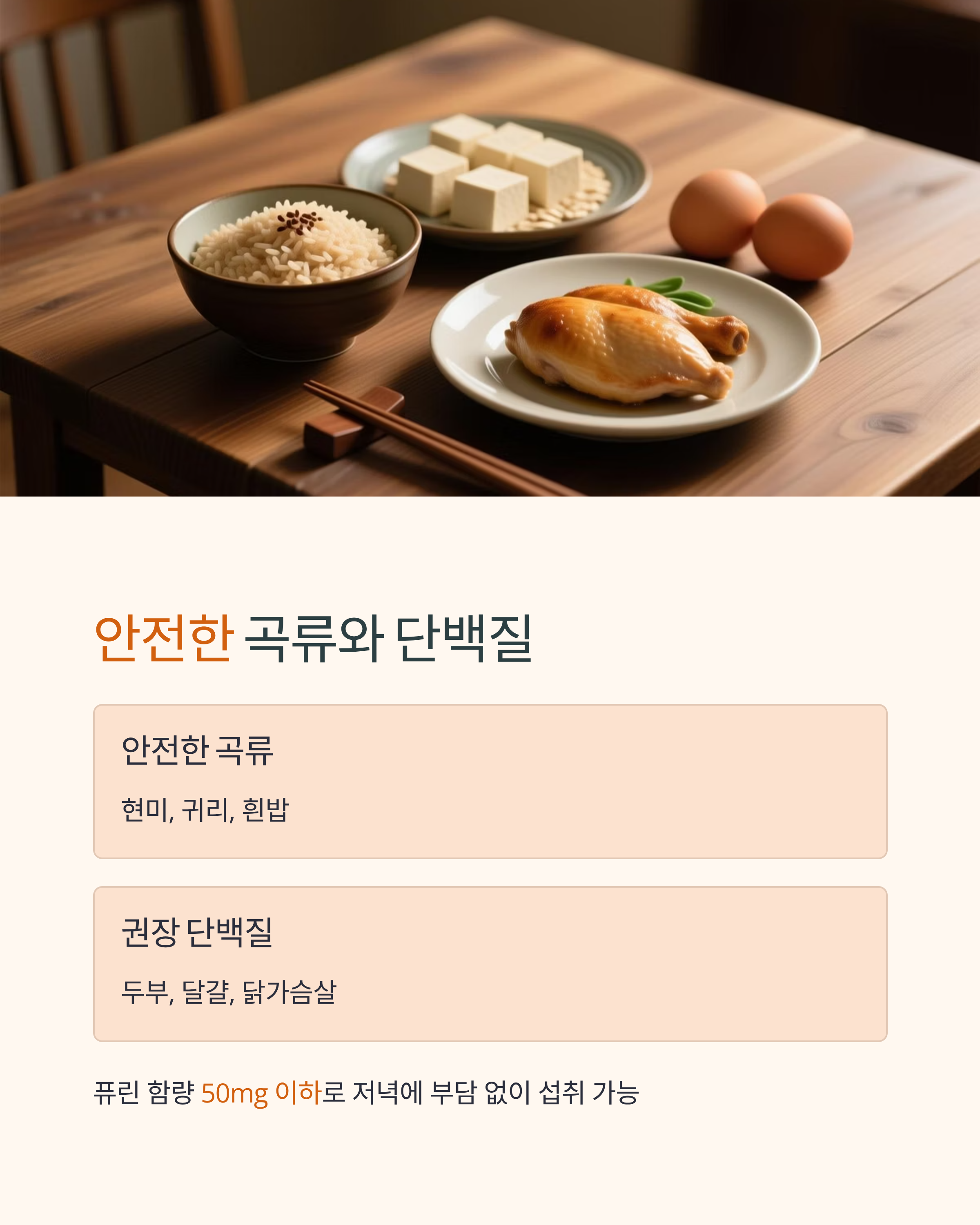 현미, 귀리, 흰밥은 퓨린이 낮아 안전하며, 단백질은 두부, 달걀, 닭가슴살을 권장합니다. 퓨린 함량이 50mg 이하로 저녁에 부담 없이 섭취할 수 있습니다.