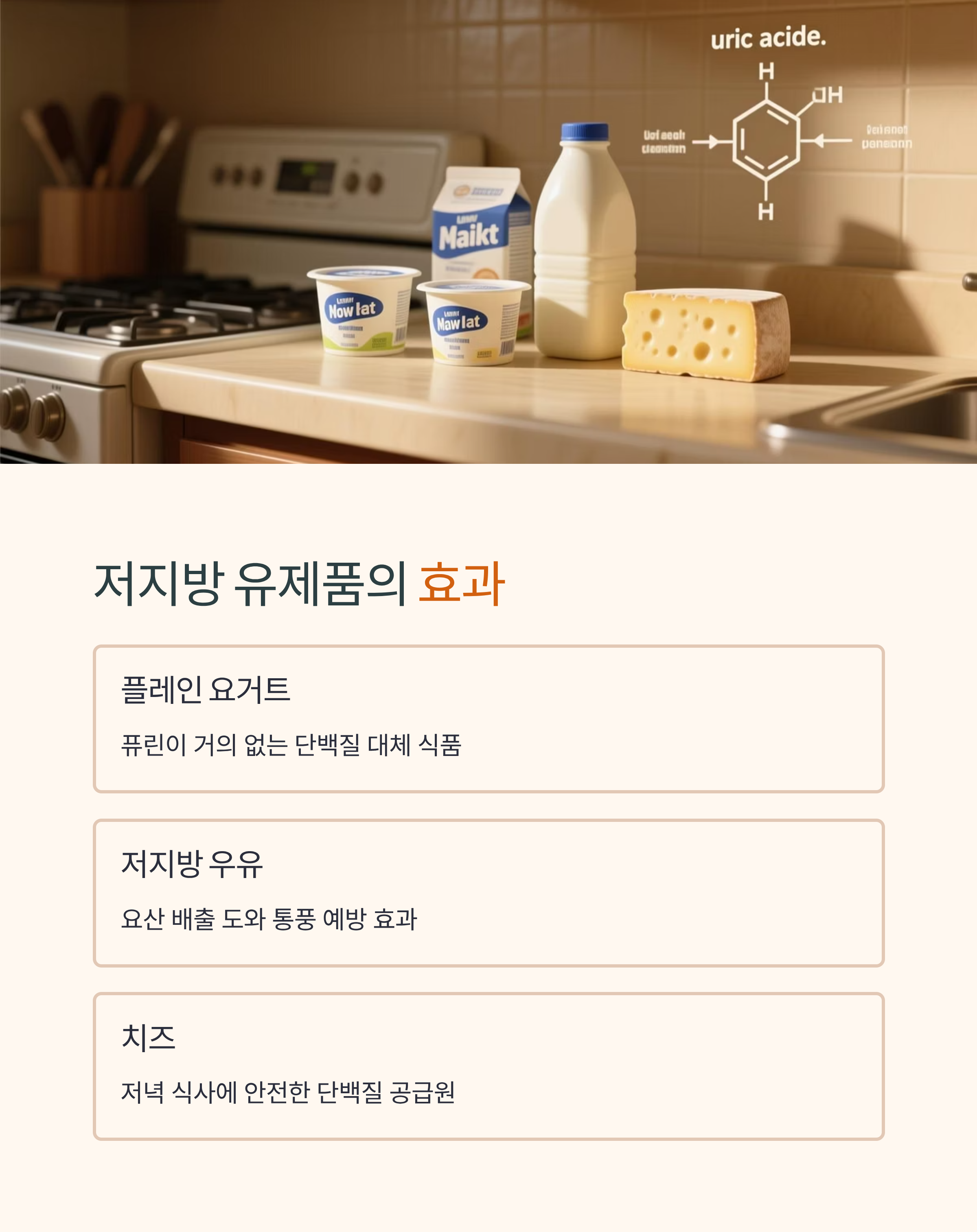 플레인 요거트, 저지방 우유, 치즈는 퓨린이 거의 없어 저녁에 좋은 단백질 대체 식품입니다. 특히 우유는 요산 배출을 도와 통풍 예방 효과가 보고되고 있습니다.
