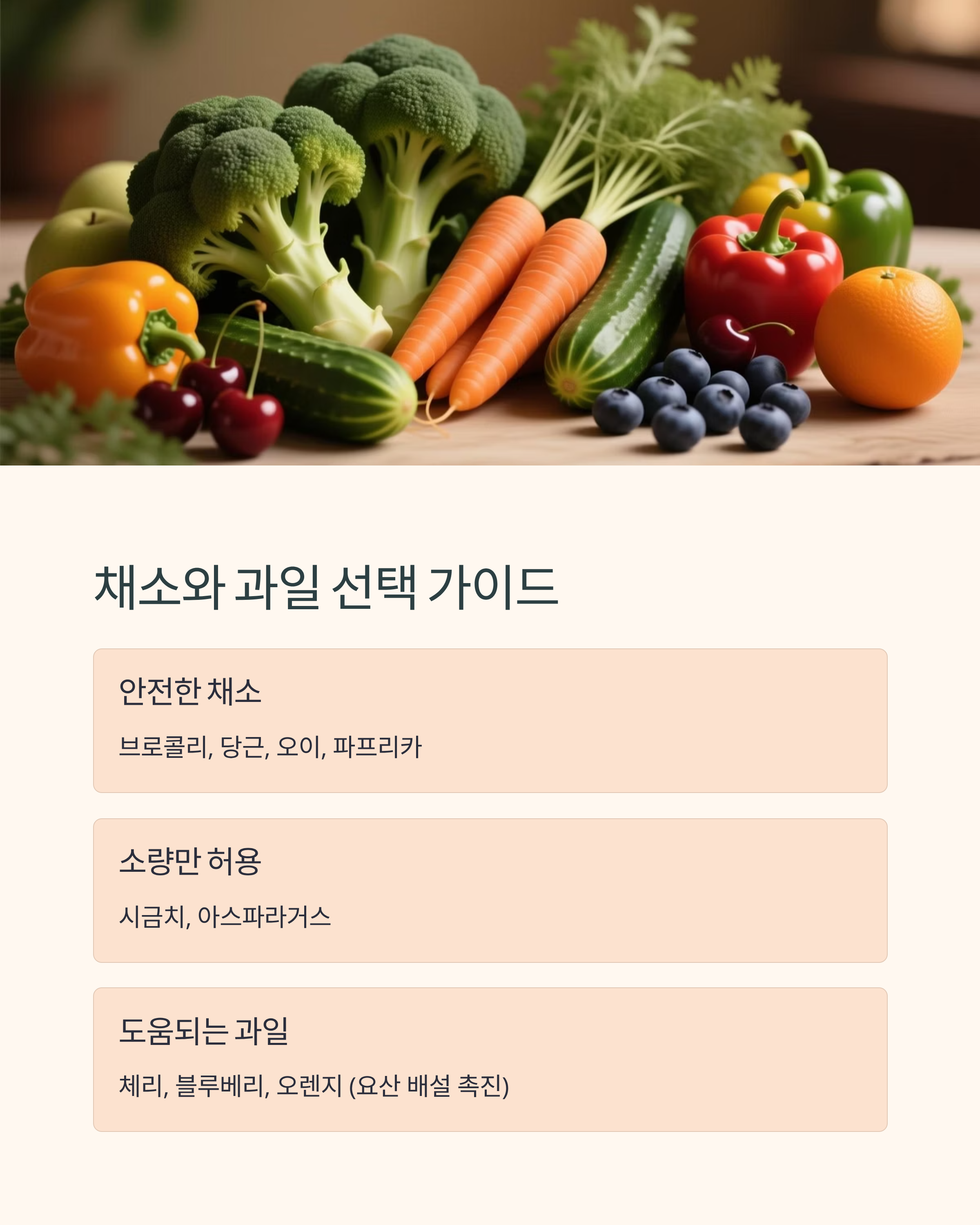 브로콜리, 당근, 오이, 파프리카는 안전하며, 시금치나 아스파라거스는 소량만 허용됩니다. 과일은 체리, 블루베리, 오렌지 등이 요산 배설을 촉진해 도움이 됩니다.