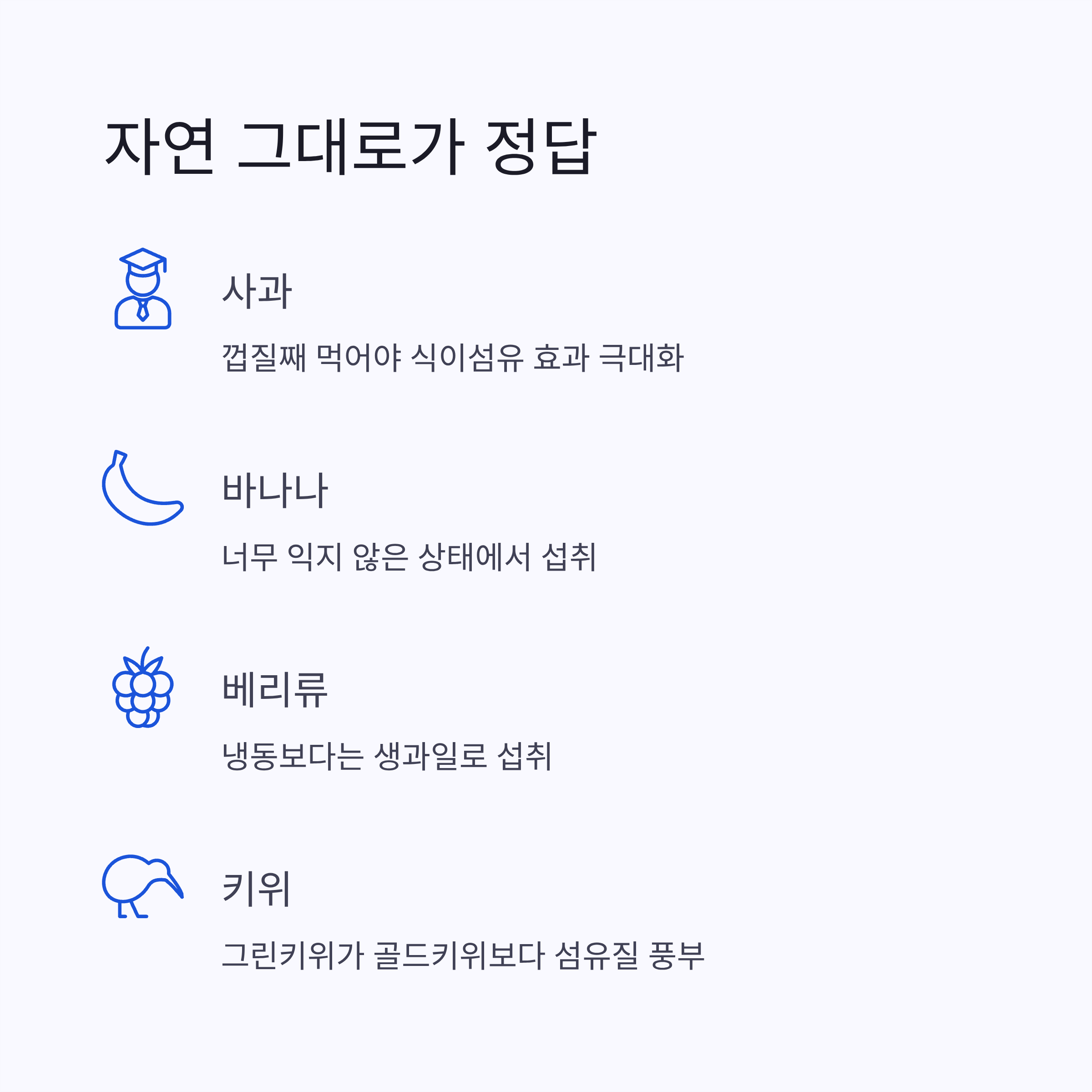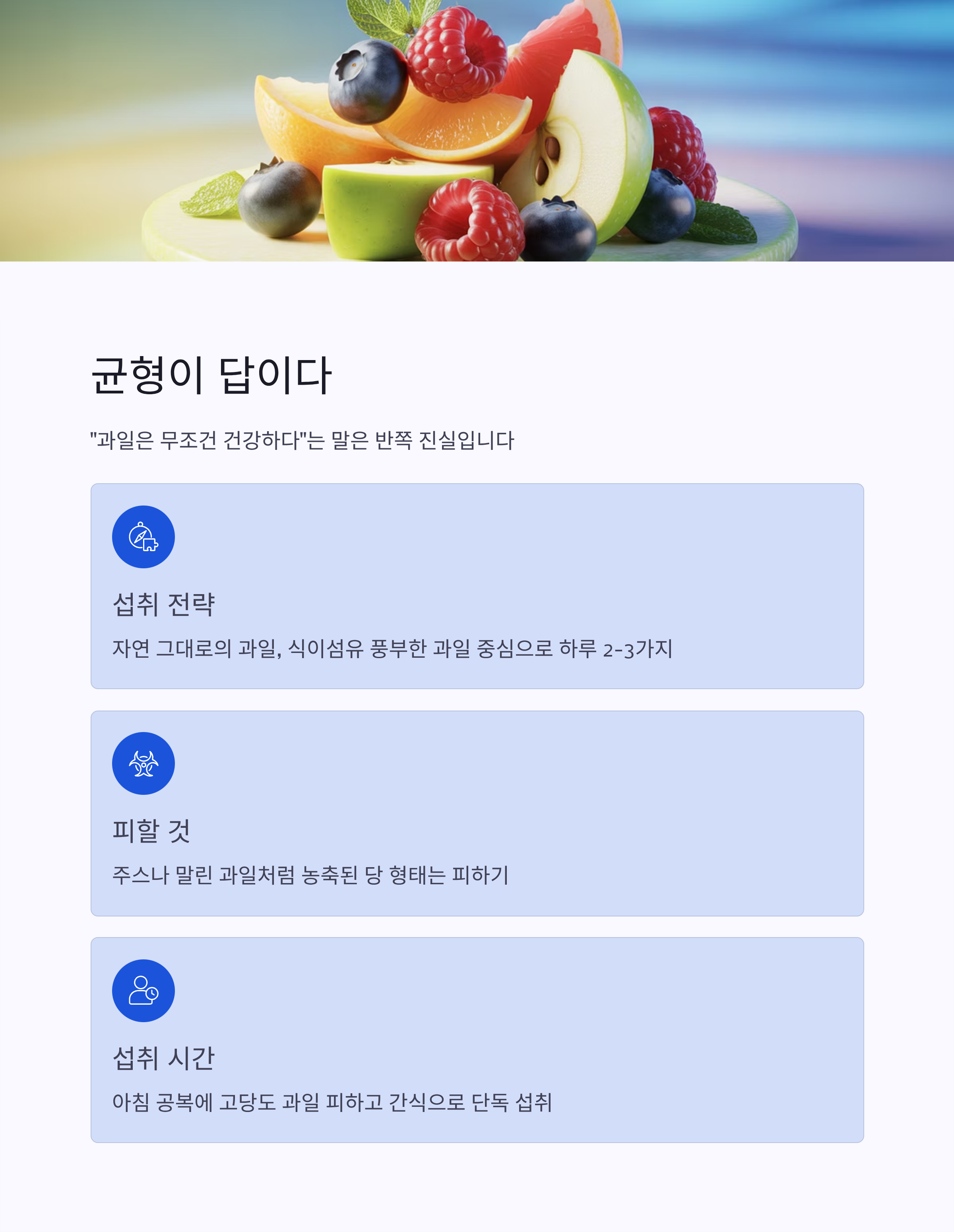 중요한 건 "과일은 적당히, 다양하게, 식이섬유 기준으로" 선택해야 한다는 점입니다.