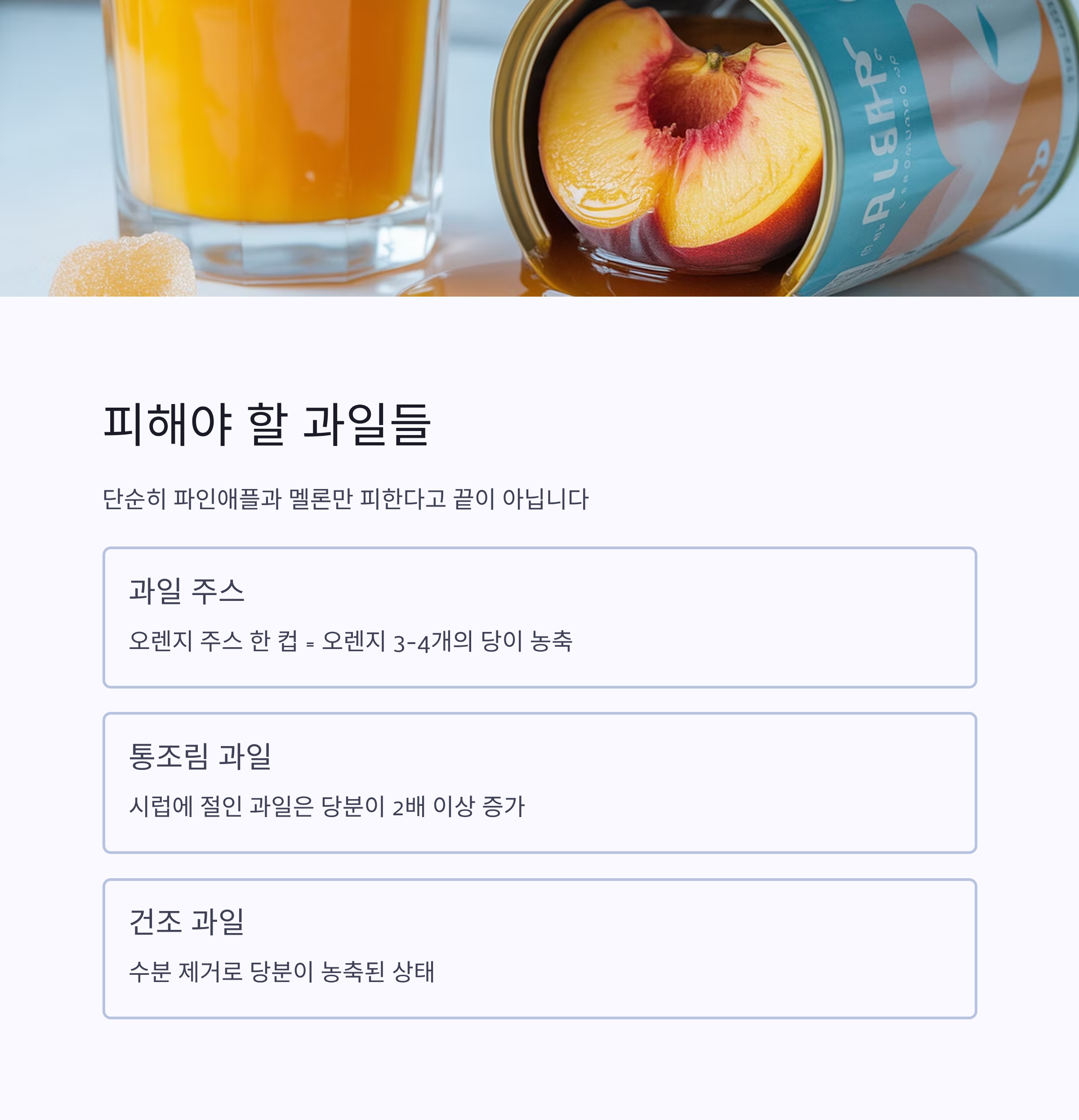 과일 주스, 통조림 과일, 건조 과일 역시 고당 농축 상태로 가공되어 있으므로 실제 당 섭취량은 생과일보다 훨씬 높습니다.