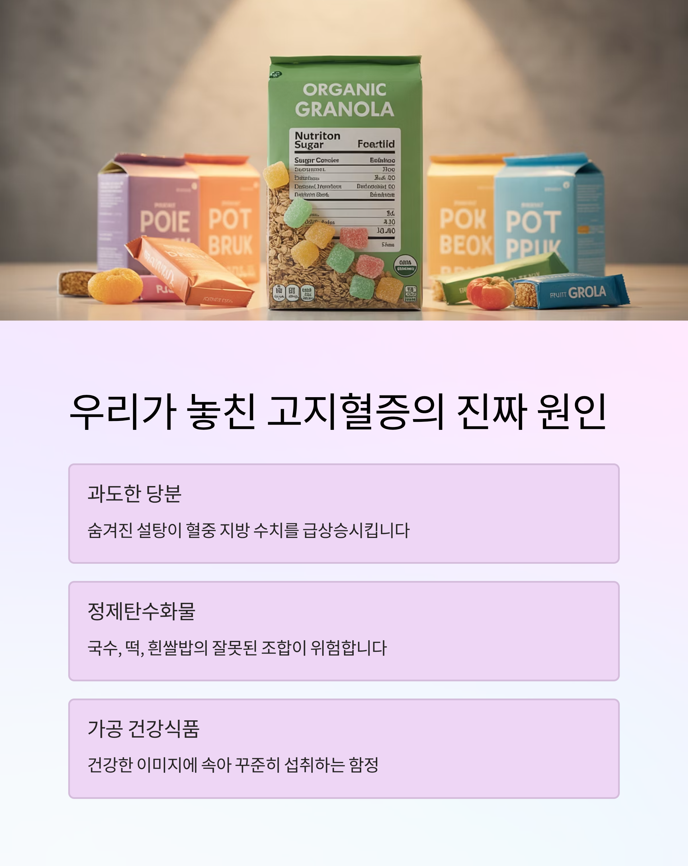 고지혈증 하면 ‘기름기 많은 음식’만을 생각하기 쉬운데, 문제는 생각보다 단순하지 않습니다. 실제로는 과도한 당분, 정제탄수화물, 가공된 건강식품들이 주범으로 떠오르고 있는데요.