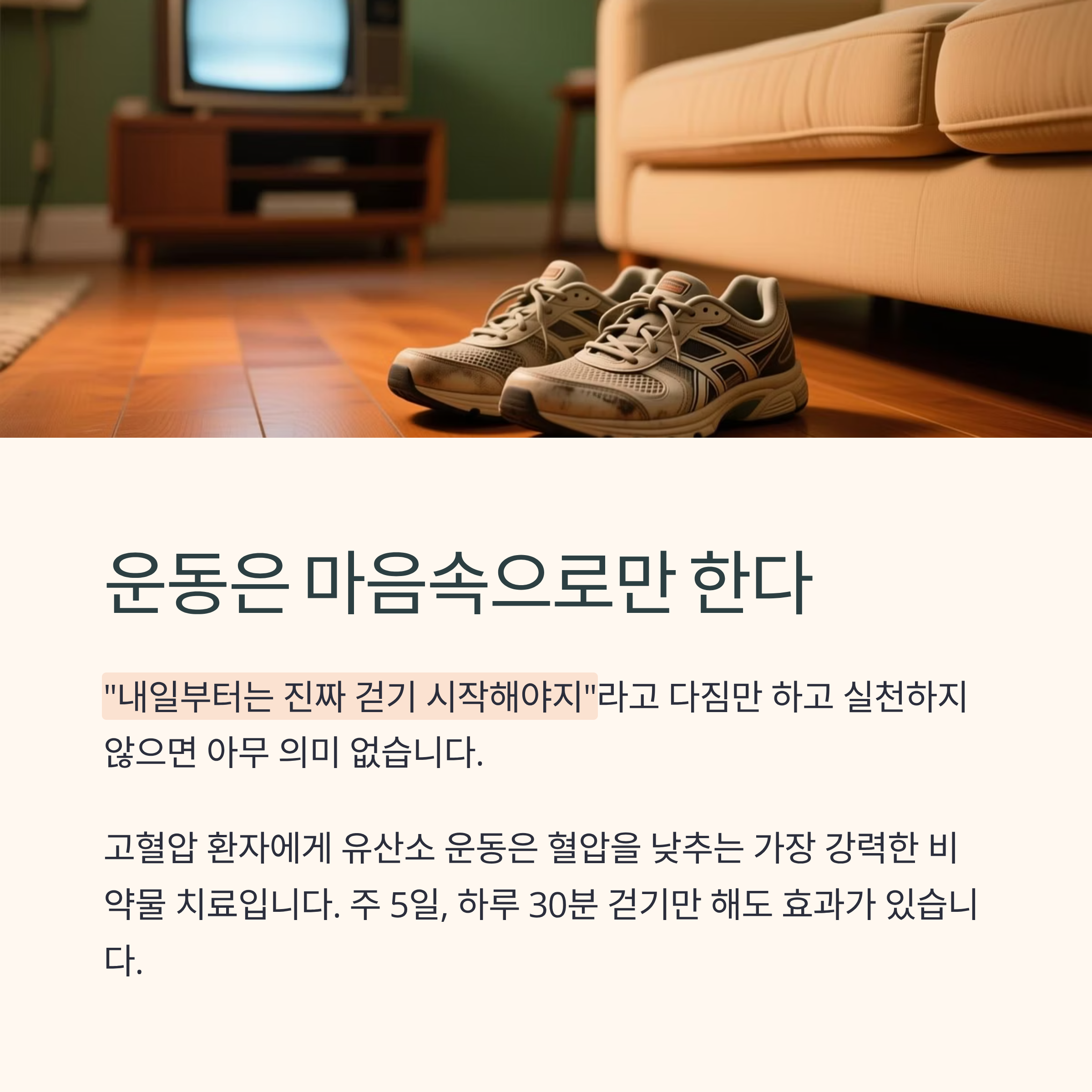 고혈압 환자에게 유산소 운동은 혈압을 낮추는 가장 강력한 비약물 치료입니다. 주 5일, 하루 30분 걷기만 해도 효과가 있습니다. 중요한 건 꾸준함입니다.