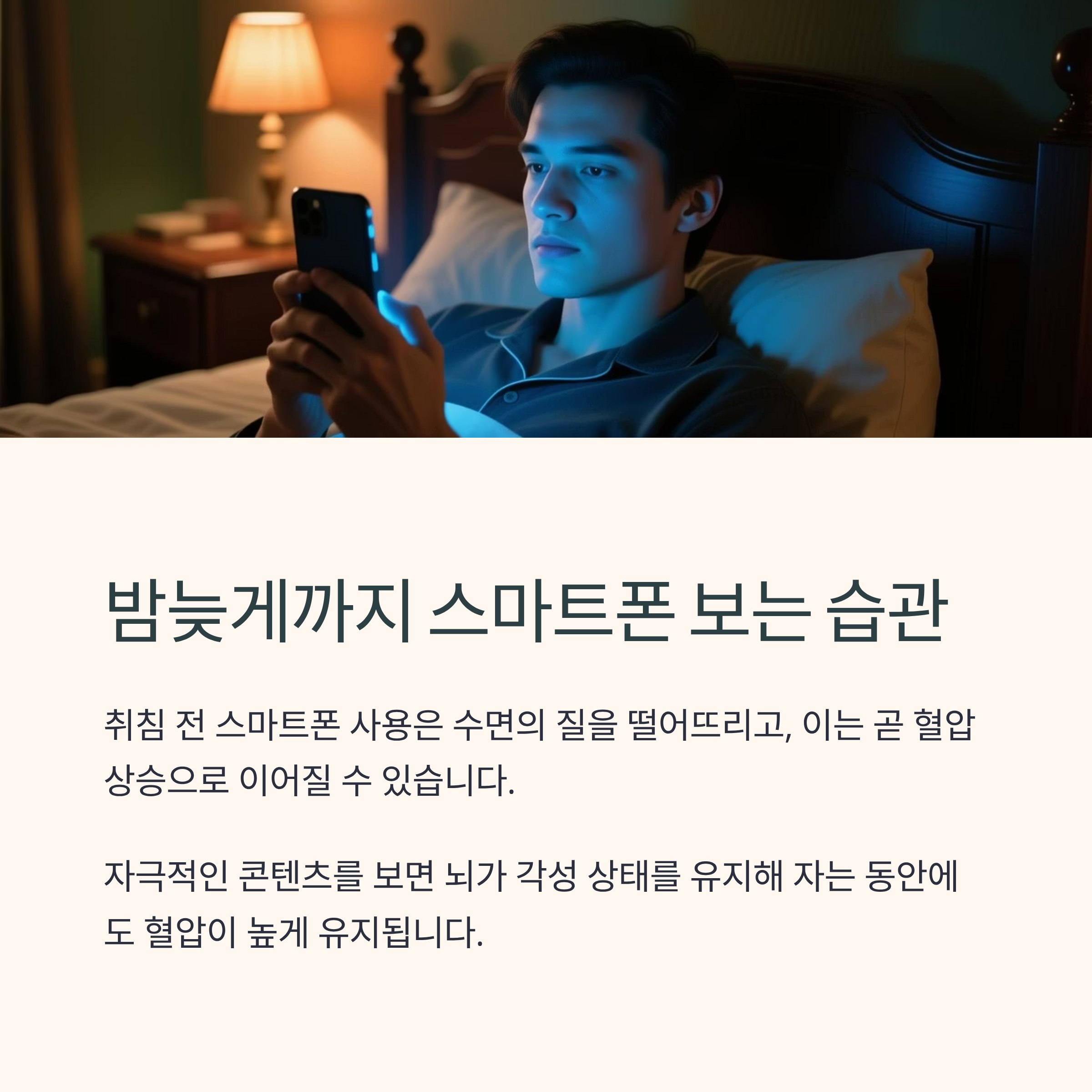 취침 전 스마트폰 사용은 수면의 질을 떨어뜨리고, 이는 곧 혈압 상승으로 이어질 수 있습니다.