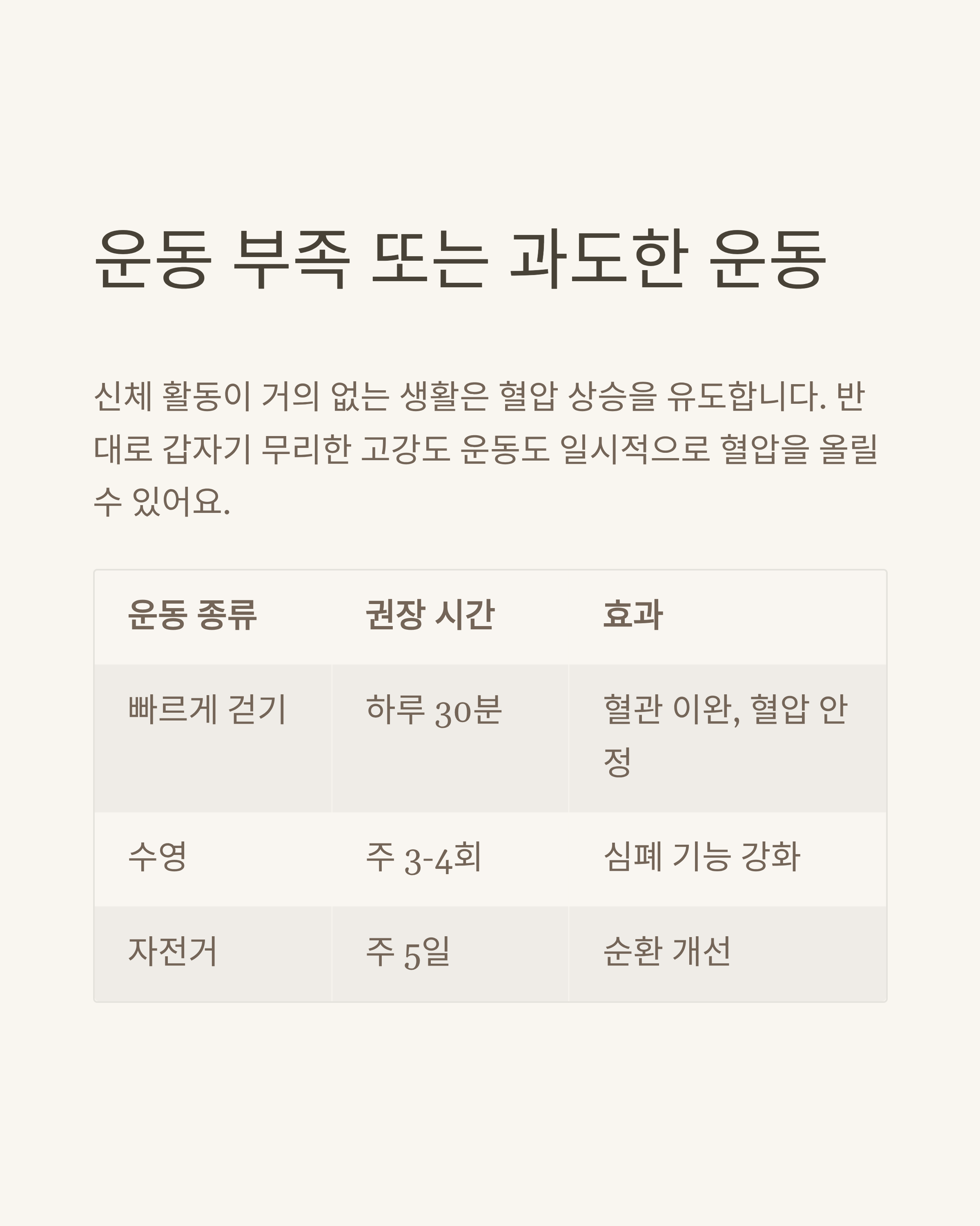 | 빠르게 걷기 | 하루 30분 | 혈관 이완, 혈압 안정 |
