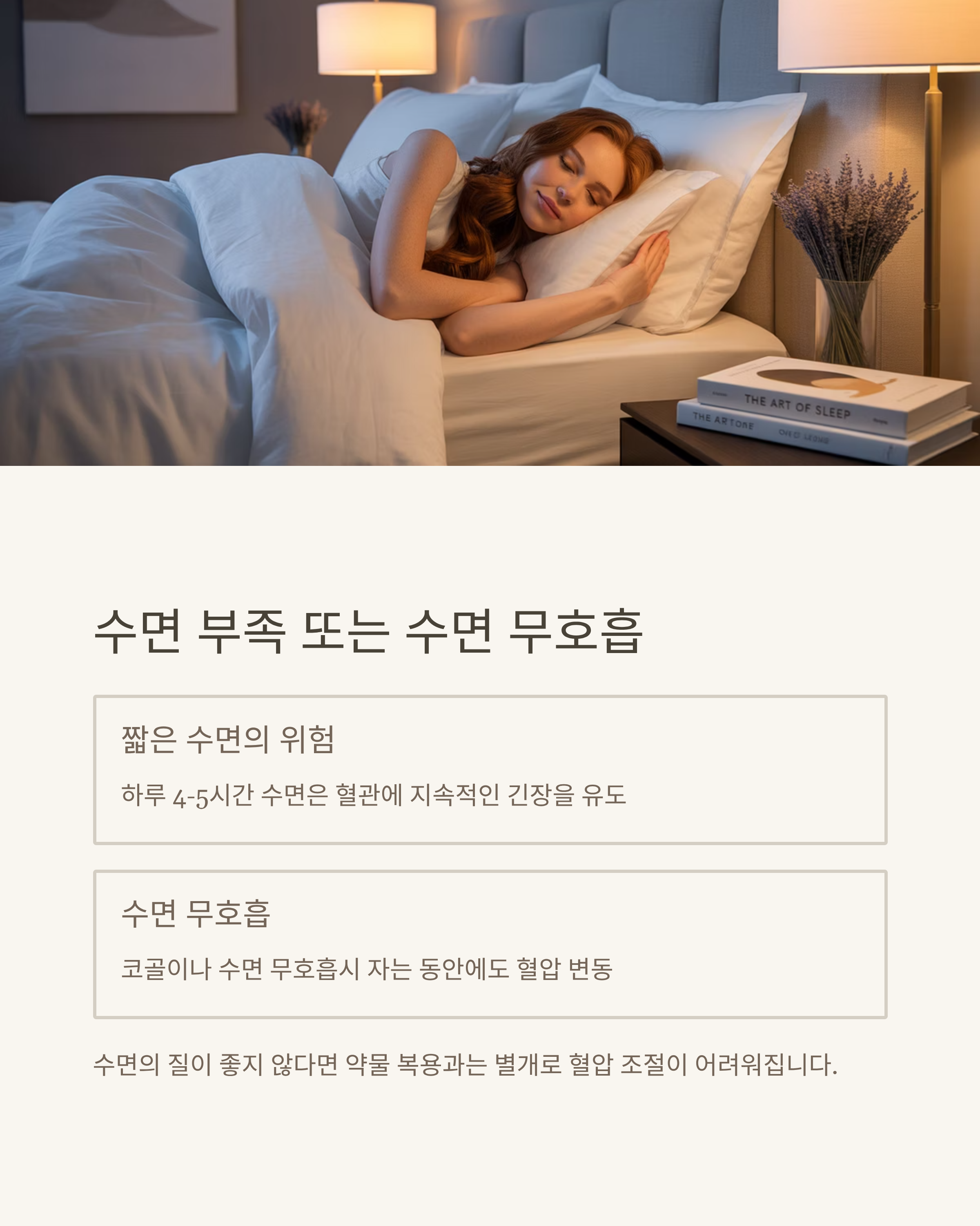 수면의 질이 좋지 않다면, 약물 복용과는 별개로 혈압 조절이 어려워질 수밖에 없습니다.