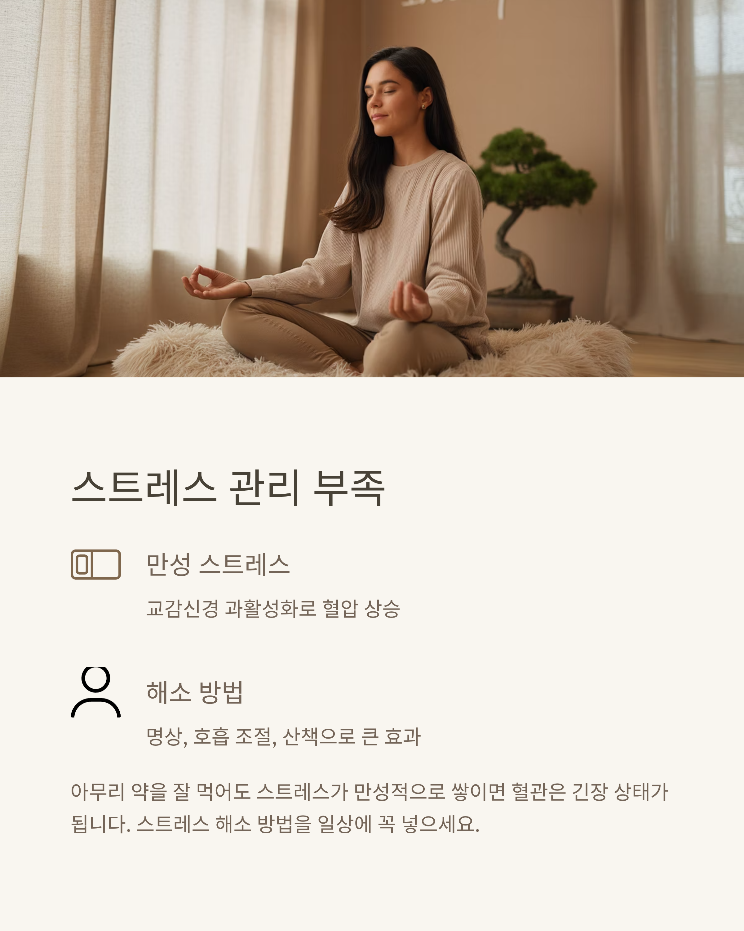 아무리 약을 잘 먹어도, 스트레스가 만성적으로 쌓이면 교감신경이 과도하게 활성화되며 혈압이 오릅니다.