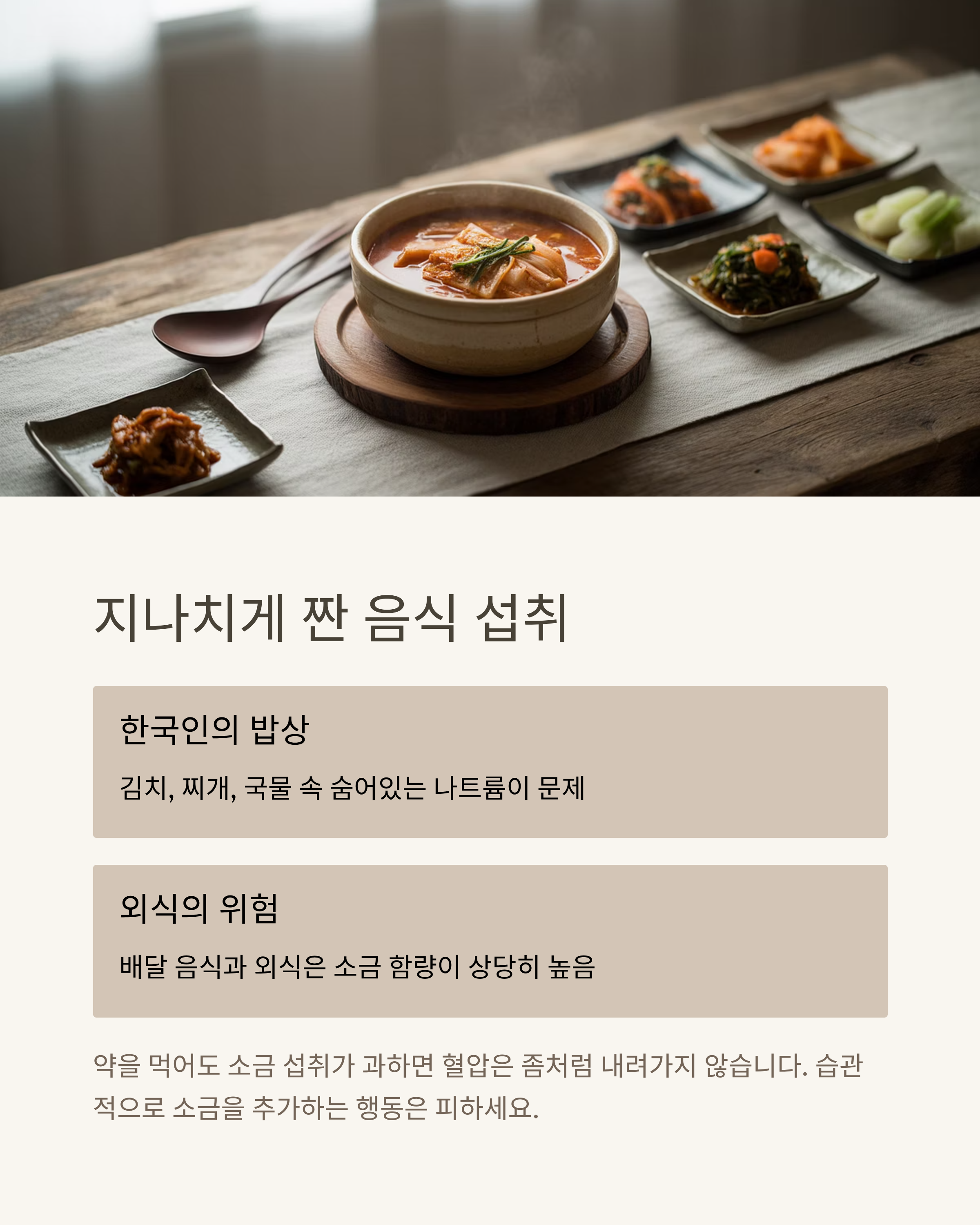 약을 먹어도 소금 섭취가 과하면 혈압은 좀처럼 내려가지 않아요. 특히 외식이나 배달 음식은 소금 함량이 상당히 높습니다.
