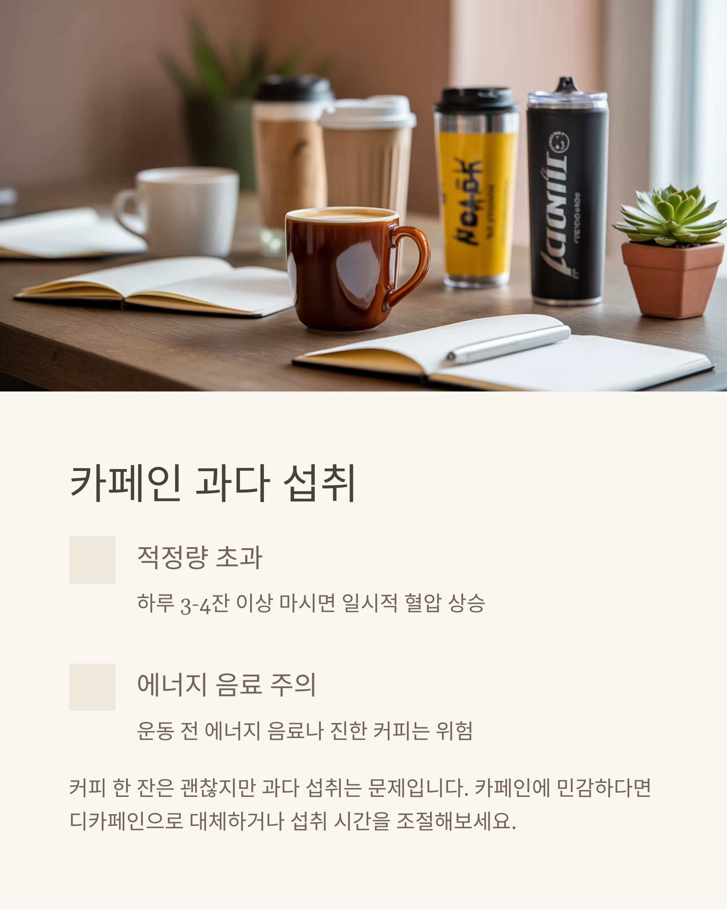 커피 한 잔은 괜찮지만, 하루 3잔~4잔 이상 마시면 카페인으로 인해 일시적인 혈압 상승이 생깁니다.