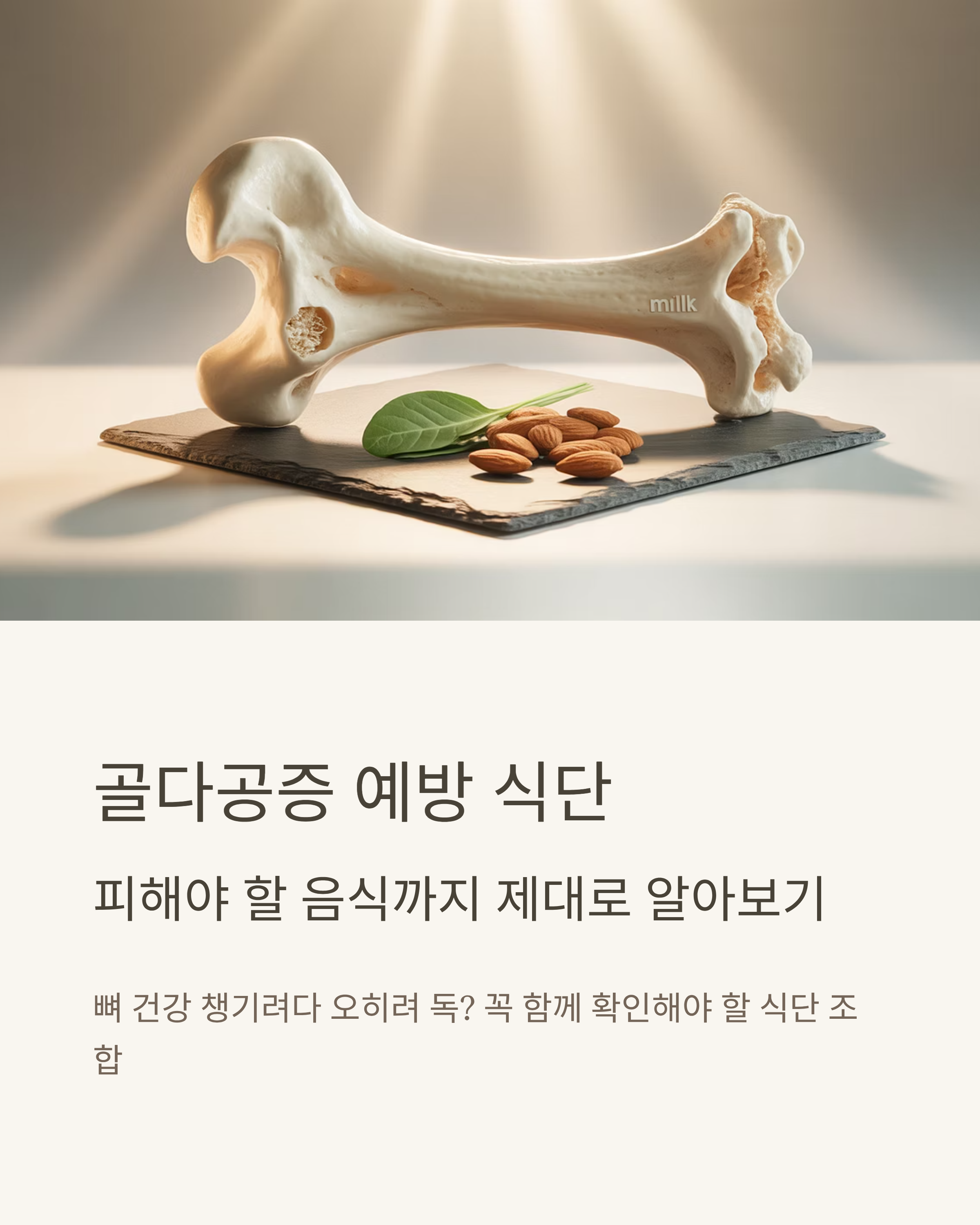골다공증은 조용히 진행되다가 어느 순간 큰 사고로 이어질 수 있는 무서운 질환입니다. 특히 중년 이후에는 뼈의 밀도가 빠르게 감소하기 때문에 예방이 무엇보다 중요하죠. 많은 분들이 뼈 건강에 좋은 음식만 챙기는데, 사실 '함께 먹으면 오히려 해가 되는 조합'도 존재합니다. 이번 글에서는 골다공증 예방에 도움이 되는 식단 구성과 함께, 절대 같이 먹으면 안 되는 음식 조합까지 꼼꼼히 살펴보겠습니다.