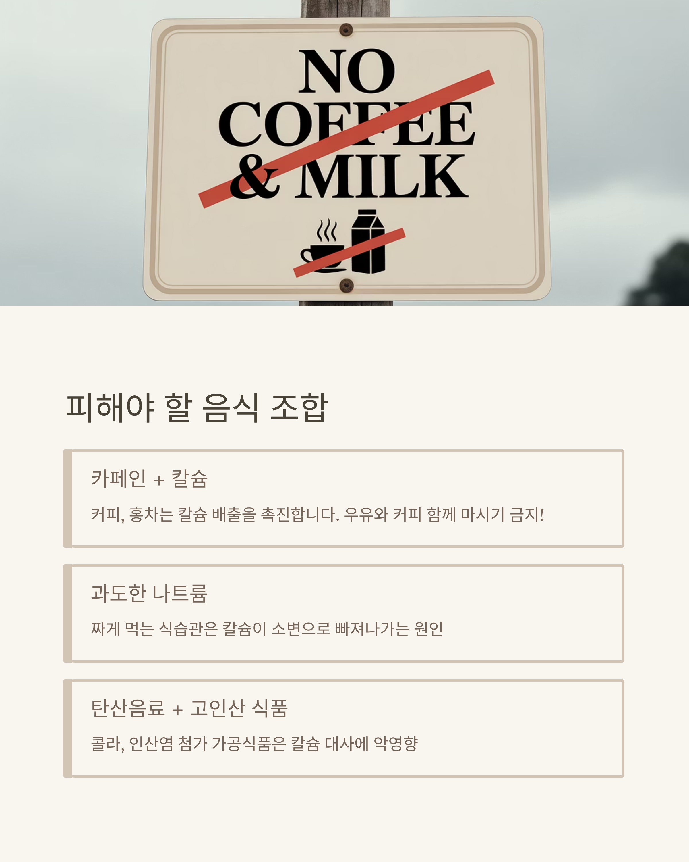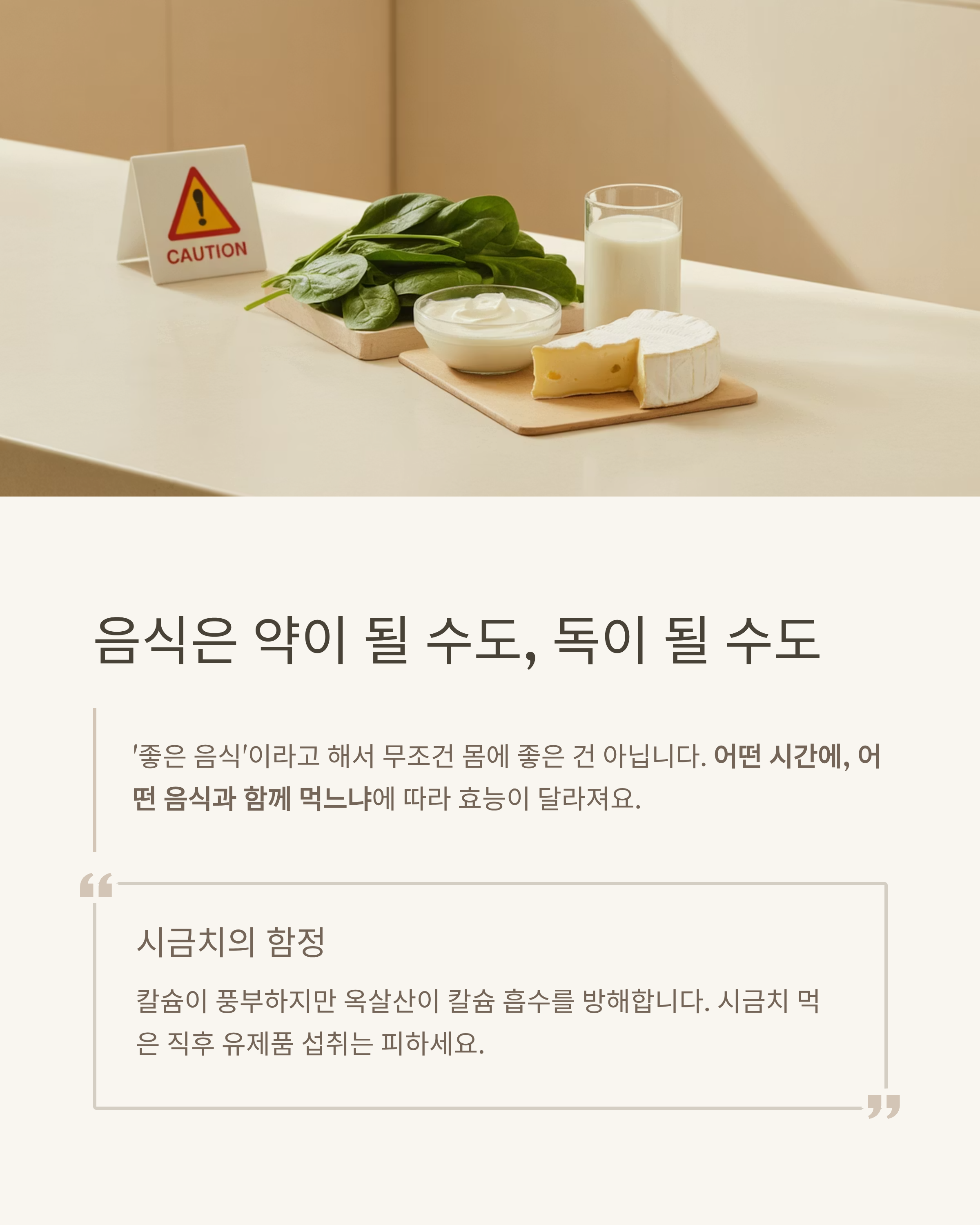 | 피해야 할 조합 | 시금치+우유, 커피+유제품, 콜라+치즈 등 |