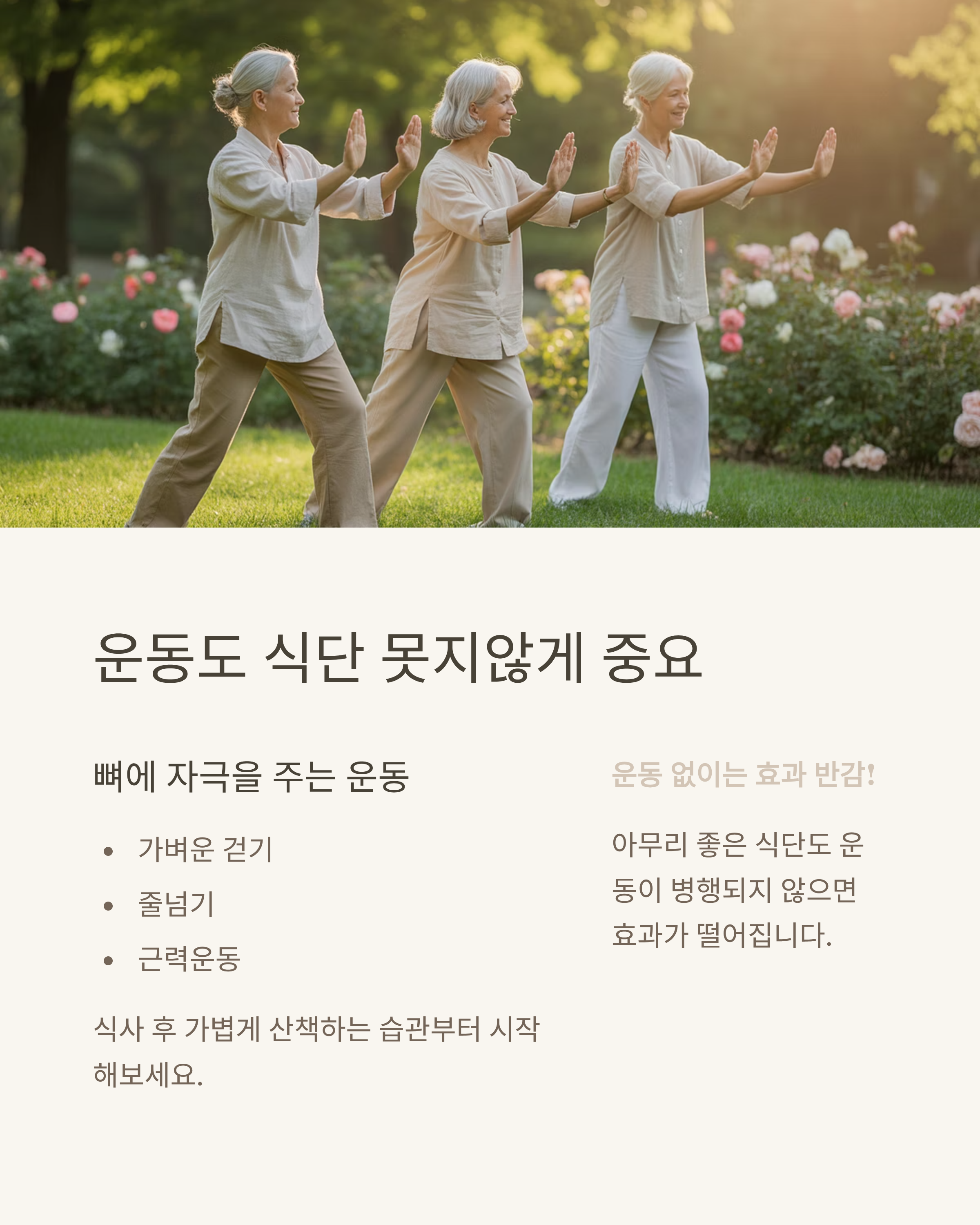아무리 좋은 식단을 실천해도, 뼈에 자극을 주는 운동이 병행되지 않으면 효과가 반감됩니다.
