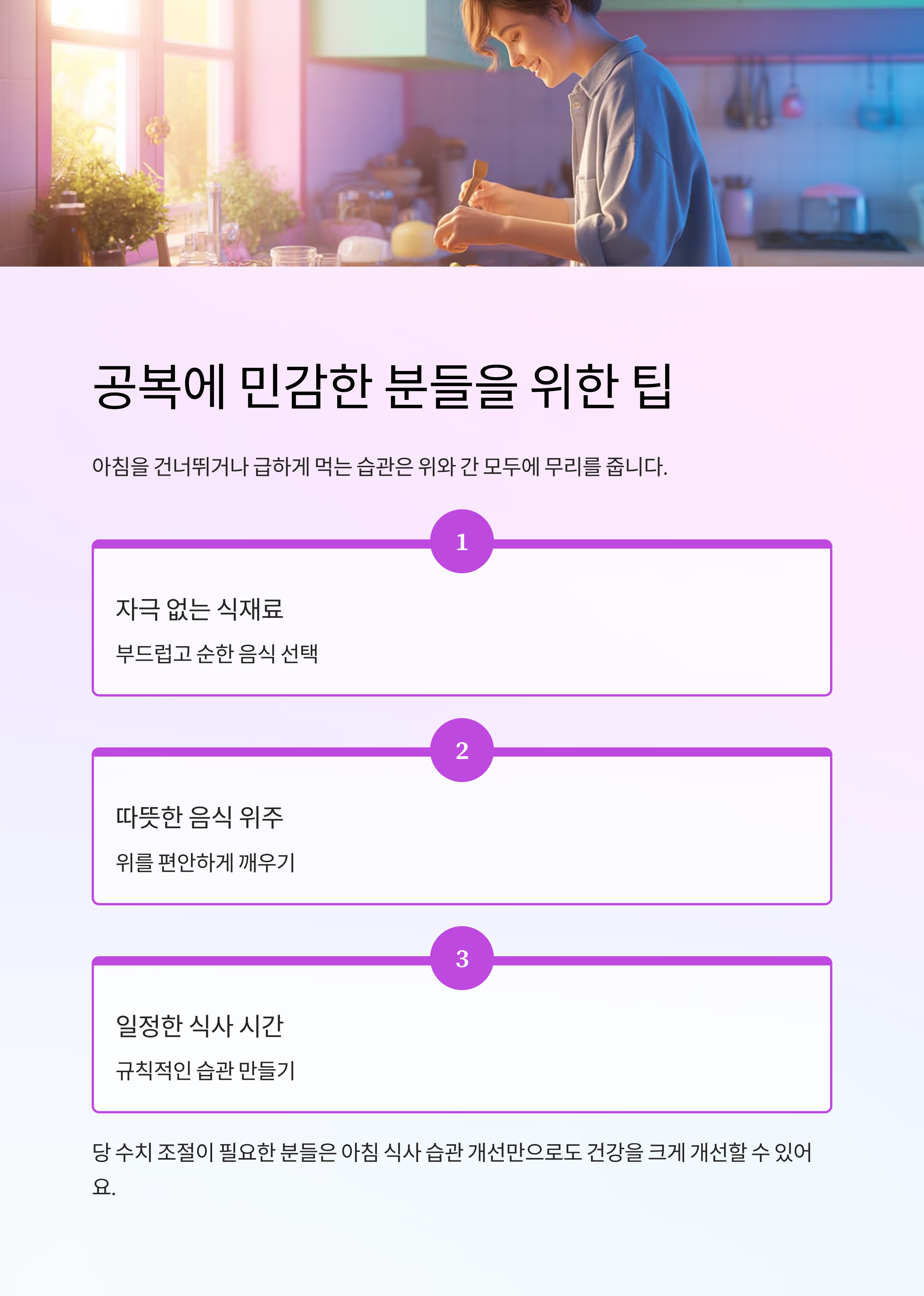 아침을 건너뛰거나 아무거나 급하게 먹는 습관은 위와 간 모두에 무리를 줍니다. 특히 당 수치 조절이 필요한 분들은 아침 식사 습관을 개선하는 것만으로도 건강을 크게 개선할 수 있어요.