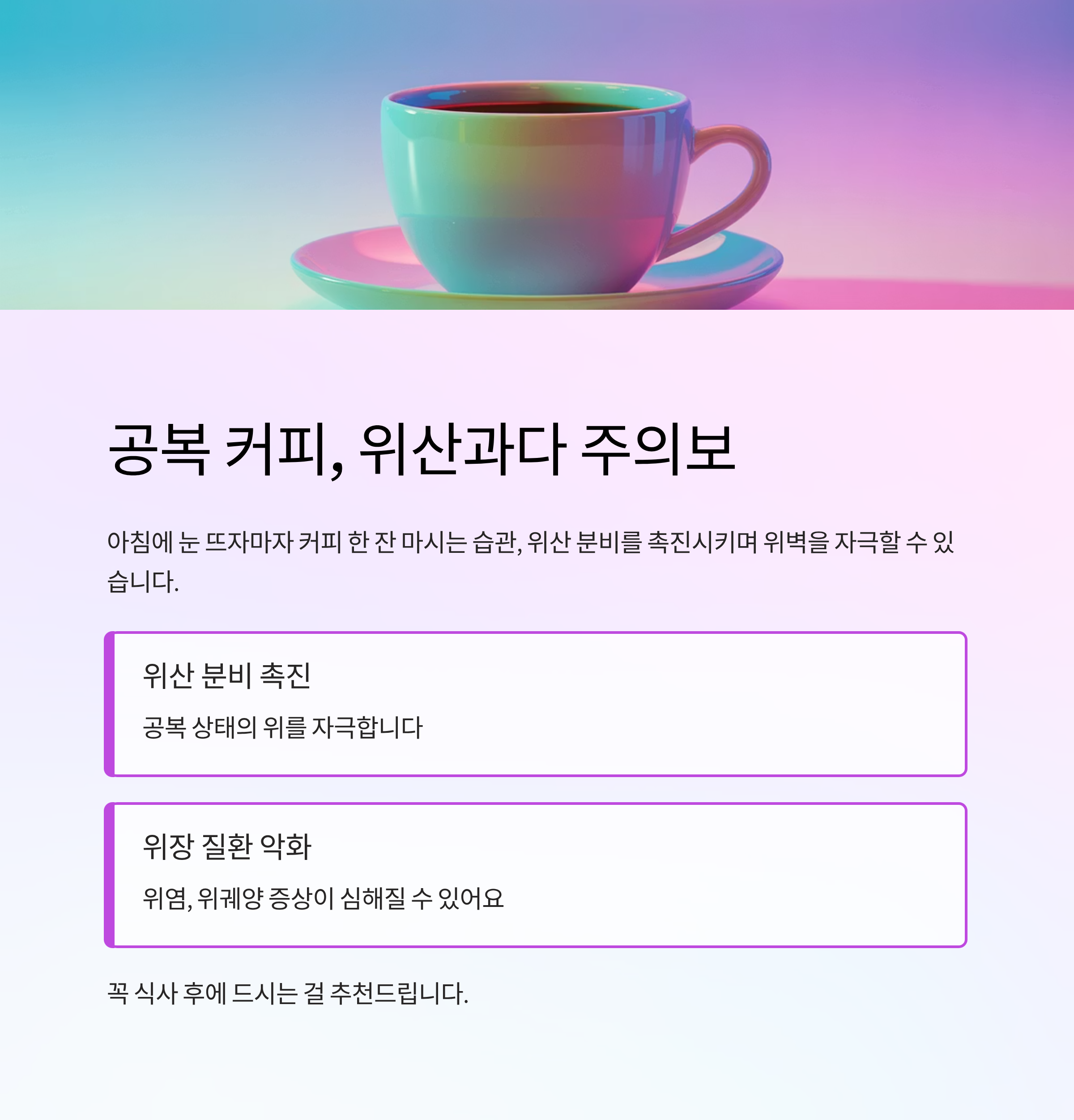 아침에 눈 뜨자마자 커피 한 잔 마시는 습관, 많은 분들이 갖고 있죠. 하지만 공복 상태의 위에 커피는 위산 분비를 촉진시키며 위벽을 자극할 수 있습니다.