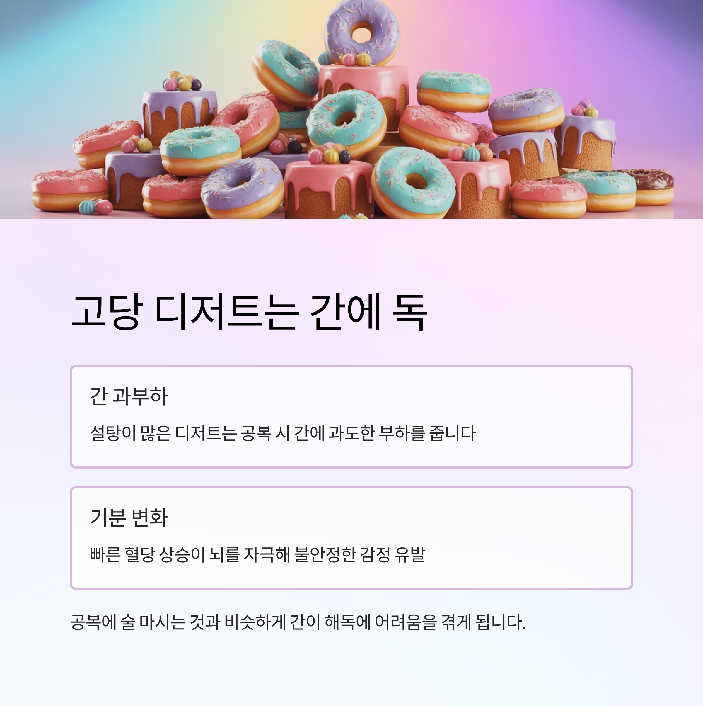 설탕이 많이 들어간 디저트류는 공복 시 섭취하면 간에 과도한 부하를 줄 수 있습니다. 마치 공복에 술을 마시는 것과 비슷하게 간이 해독에 어려움을 겪게 되죠.