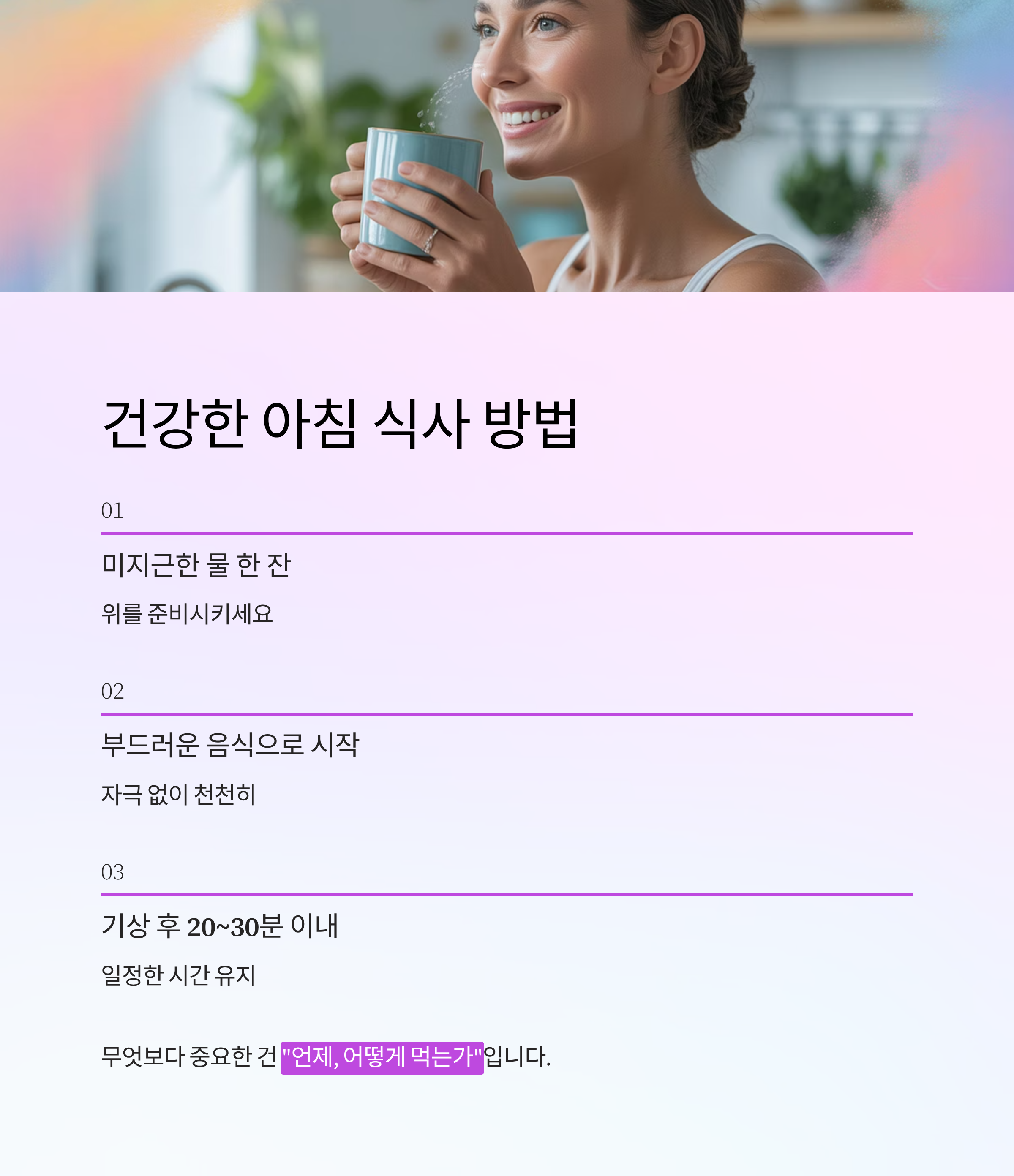 식사는 기상 후 20~30분 이내에 하되, 식사 시간과 내용이 일정해야 위장 건강도 지킬 수 있습니다. 무엇보다 중요한 건 “언제, 어떻게 먹는가”입니다.
