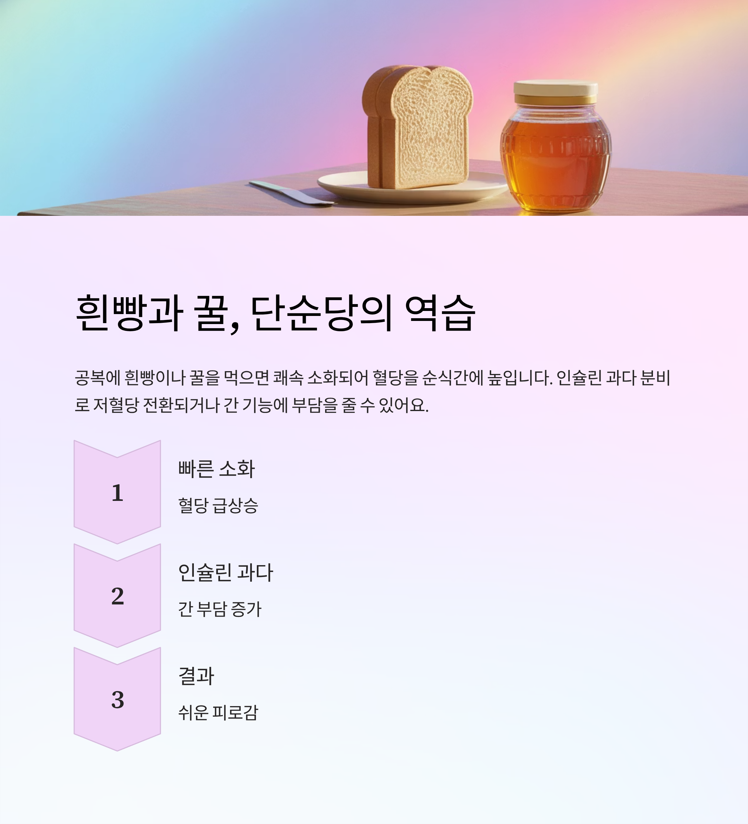 공복에 흰빵이나 꿀을 먹으면 쾌속 소화되어 혈당을 순식간에 높이게 됩니다. 이로 인해 인슐린이 과도하게 분비되면서 오히려 저혈당으로 전환되거나, 간 기능에 부담을 줄 수 있어요.