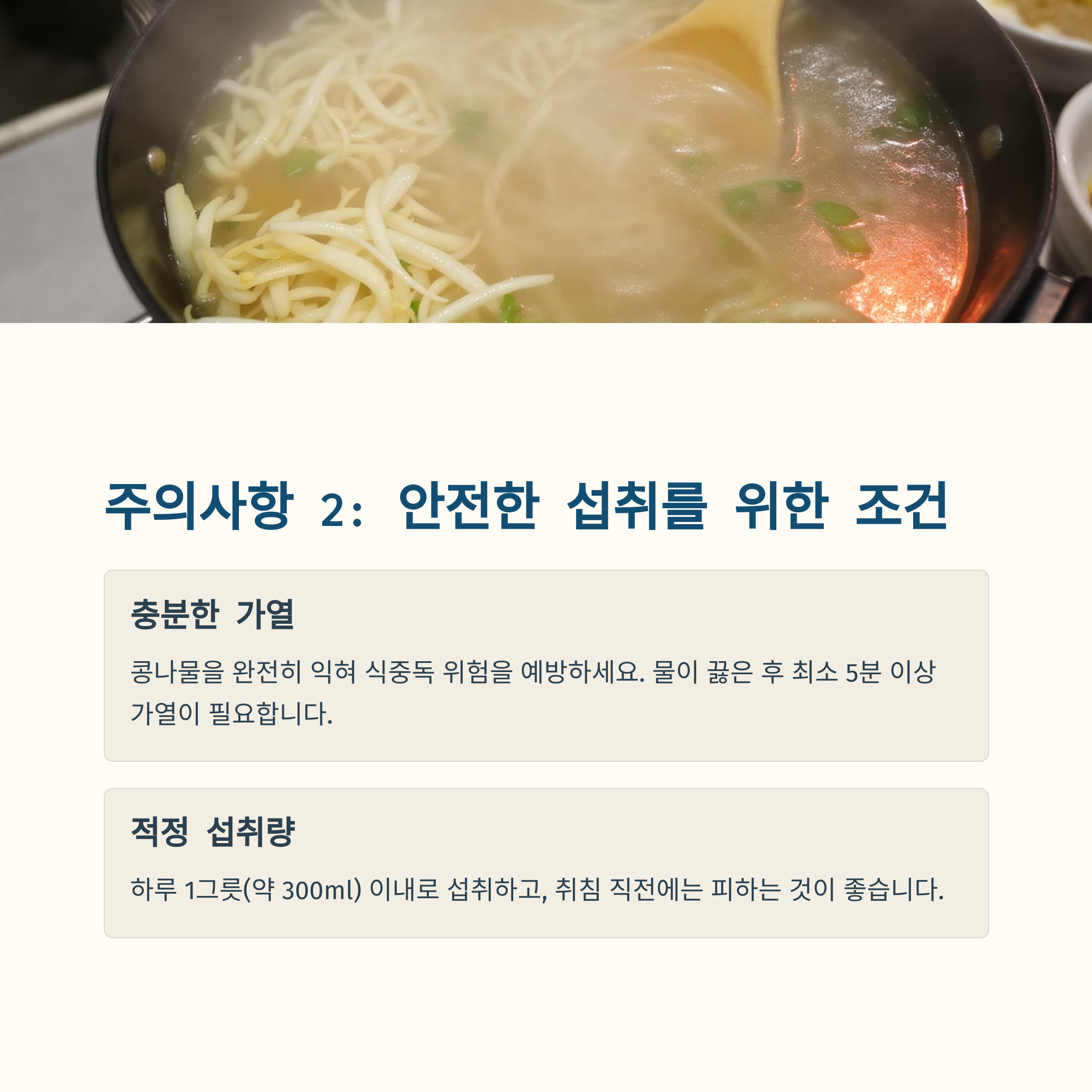 하지만 모든 장점에도 불구하고, 콩나물국을 공복에 과다하게 섭취하는 것은 주의가 필요합니다. 불용성 식이섬유가 과하게 들어가면 오히려 위장을 자극하여 복부 팽만감이나 설사를 유발할 수 있습니다. 하루 섭취량을 2그릇 이상으로 늘리면 약 22퍼센트의 사람들에게 소화불량 증상이 나타났다는 임상 데이터가 있습니다. 또한, 콩나물을 사용할 때 저온 살균이 제대로 이루어지지 않으면 살모넬라나 대장균과 같은 유해 세균에 노출될 위험이 있습니다. 특히 생콩나물 상태에서 섭취할 경우 이러한 위험이 더욱 커지므로 반드시 75도 이상에서 1분 이상 끓이는 것이 안전합니다.