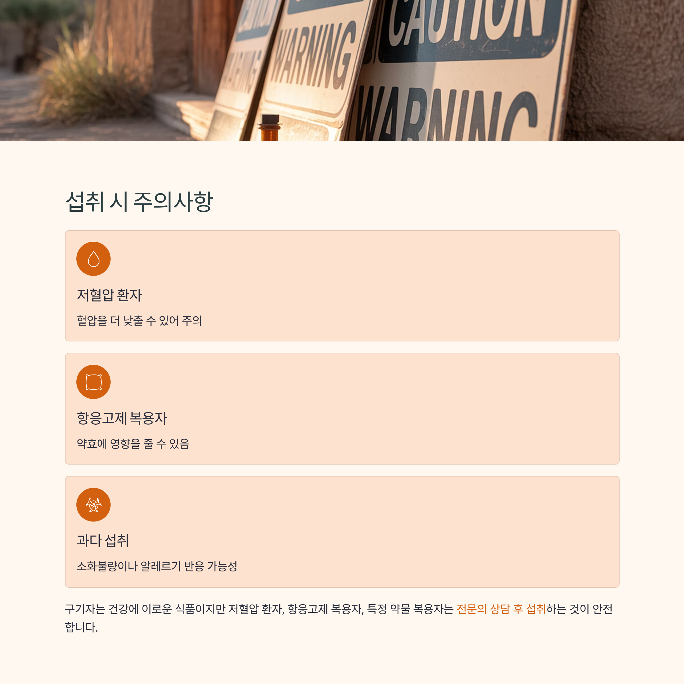 다만 혈압이 낮거나 특정 약물을 복용하는 경우, 과다 섭취 시 부작용 가능성이 있어 주의가 필요합니다.