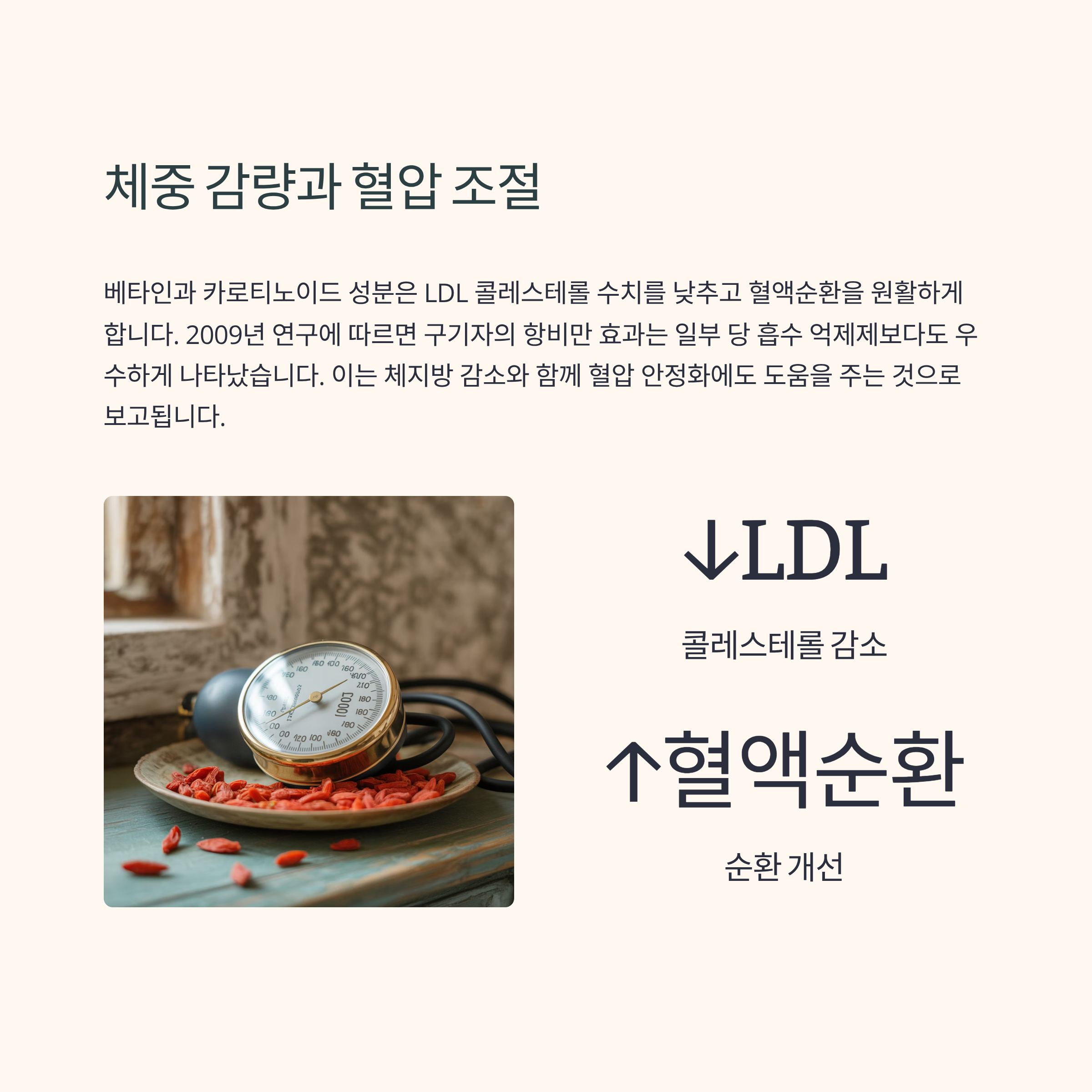 베타인과 카로티노이드 성분은 LDL 콜레스테롤 수치를 낮추고 혈액순환을 원활하게 합니다.