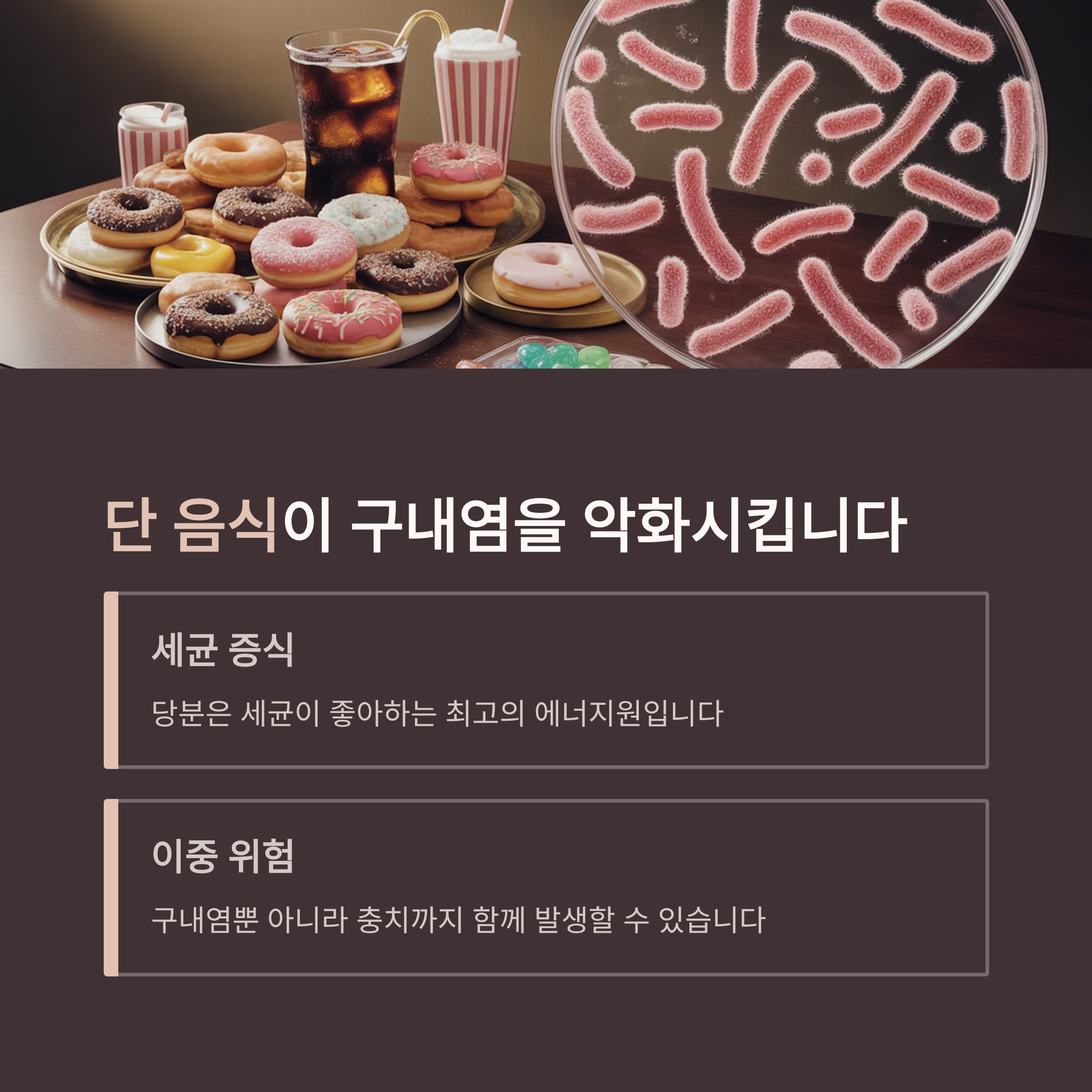 달콤한 간식이나 음료를 자주 섭취하면 입 안 세균이 증가하고, 이는 염증과 감염의 원인이 될 수 있어요.