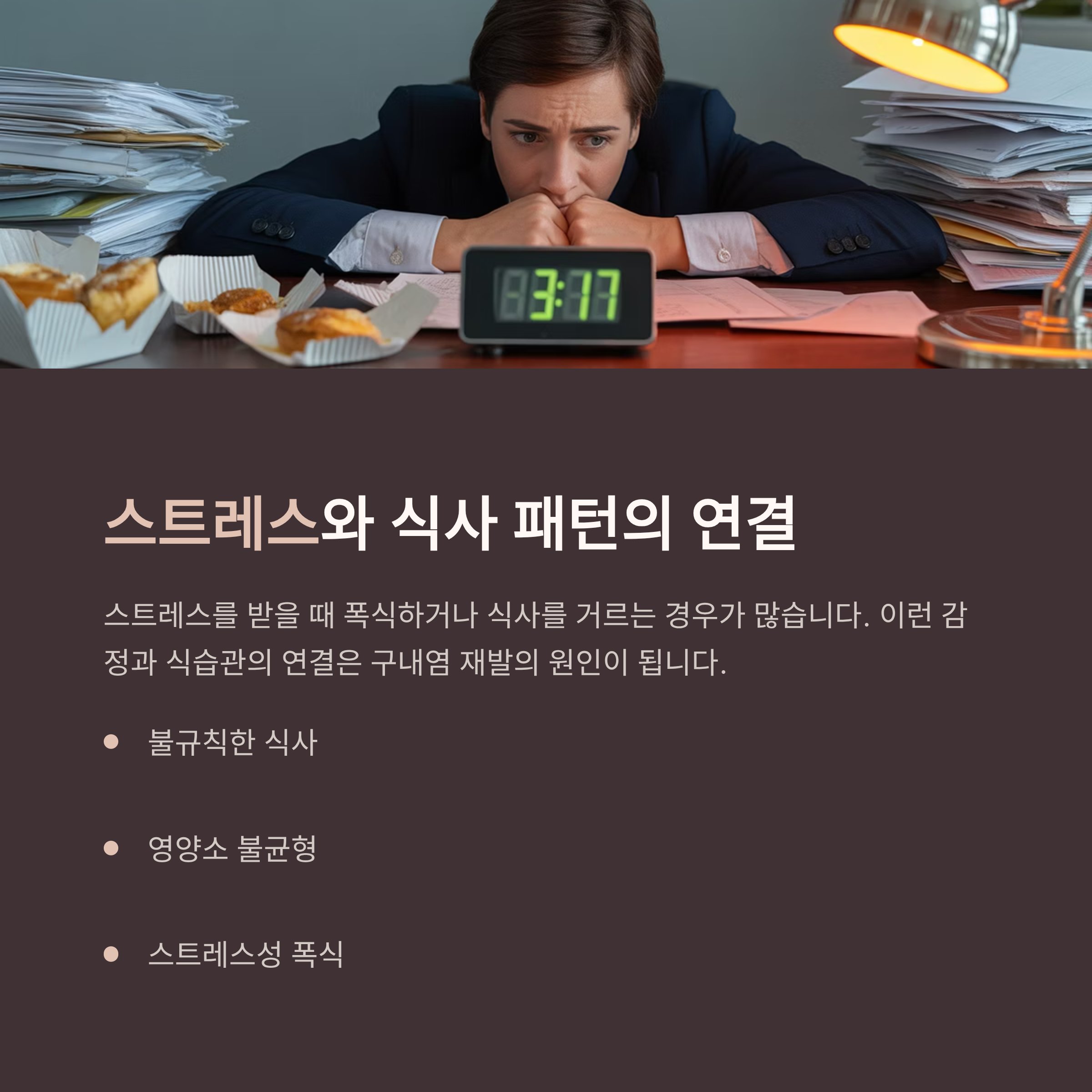 이처럼 감정과 식습관이 연결되어 있으면 입 안 건강에도 바로 영향을 미칩니다.