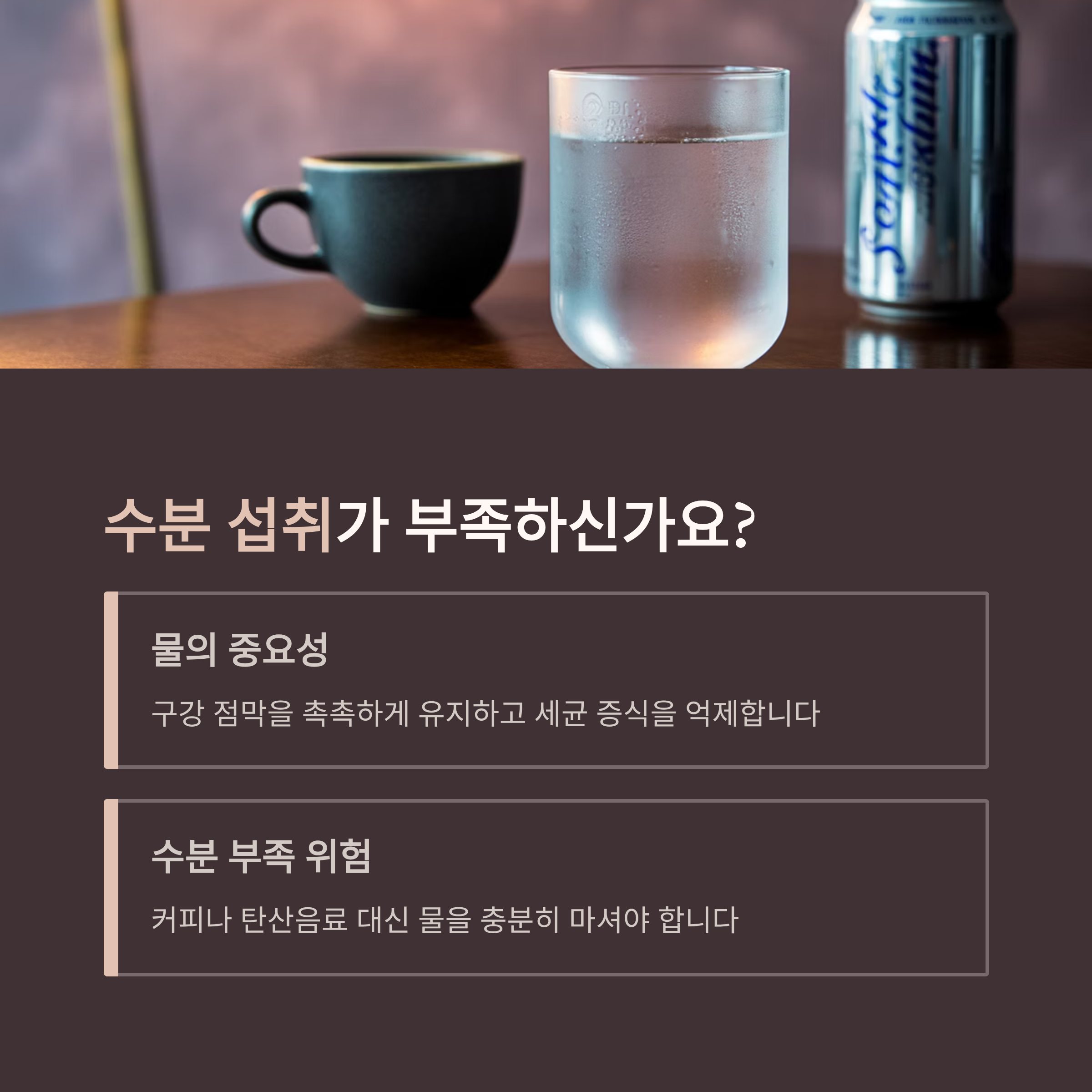 물은 구강 점막을 촉촉하게 유지하고, 입 안의 세균 증식을 억제하는 데 매우 중요합니다.