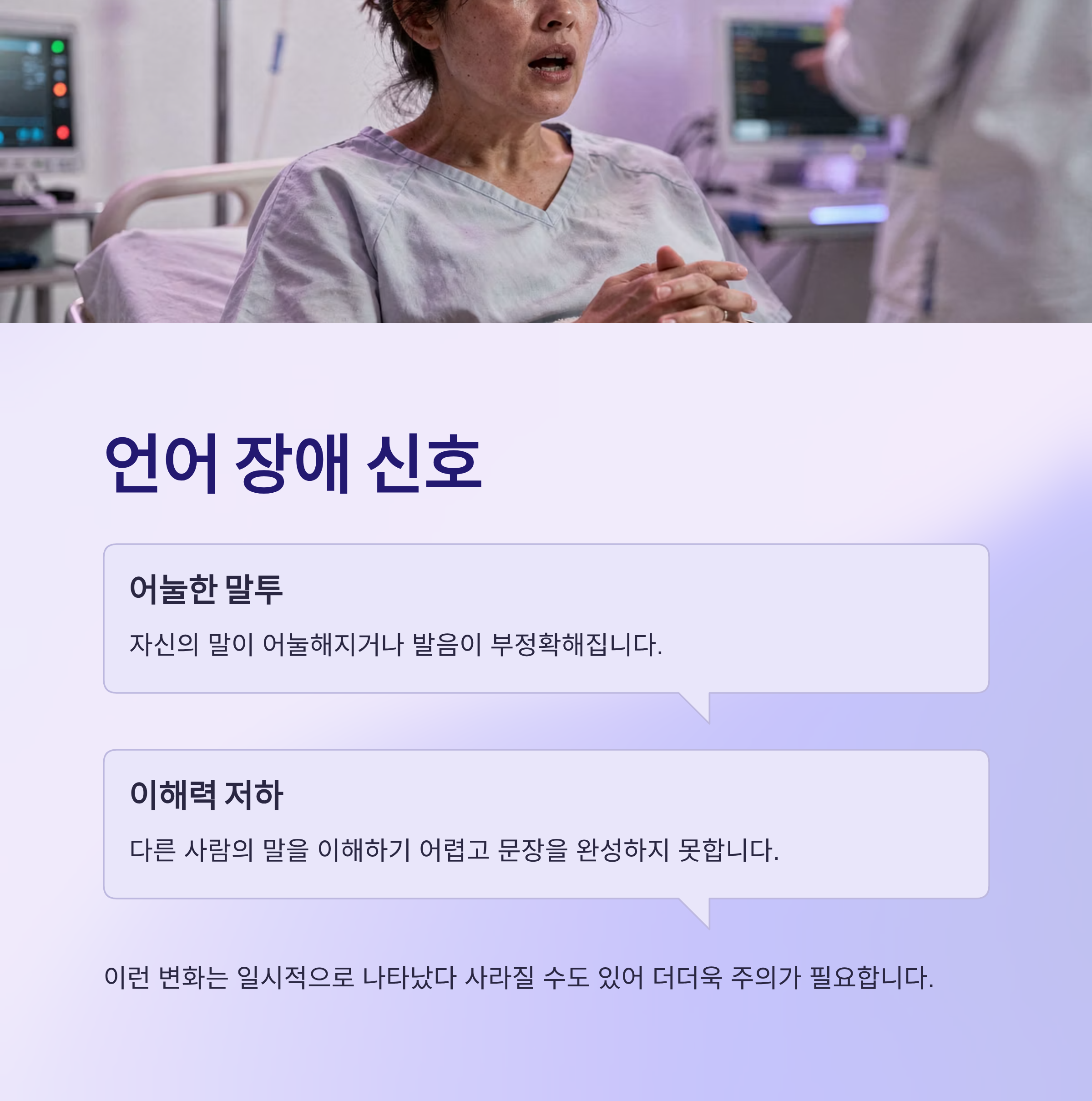 자신의 말이 어눌해지거나, 다른 사람의 말을 이해하기 어렵고 문장을 완성하지 못하는 증상 역시 뇌졸중의 위험 신호입니다. 이런 변화는 일시적으로 나타났다 사라질 수도 있어 더더욱 주의가 필요합니다.