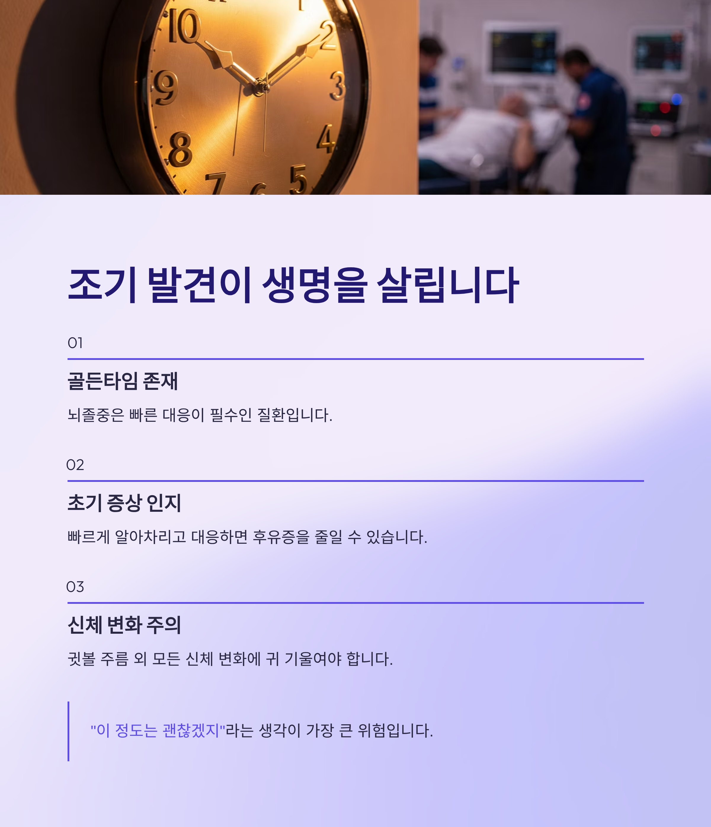 뇌졸중은 "골든타임"이 있는 질환입니다. 초기 증상을 알아차리고 빠르게 대응한다면 후유증을 줄일 수 있고, 생명을 지킬 수 있습니다. 귓볼 주름도 하나의 신호지만, 나머지 신체 변화에도 항상 귀 기울여야 합니다. "이 정도는 괜찮겠지"라는 생각이 가장 큰 위험이라는 점, 잊지 마세요.
