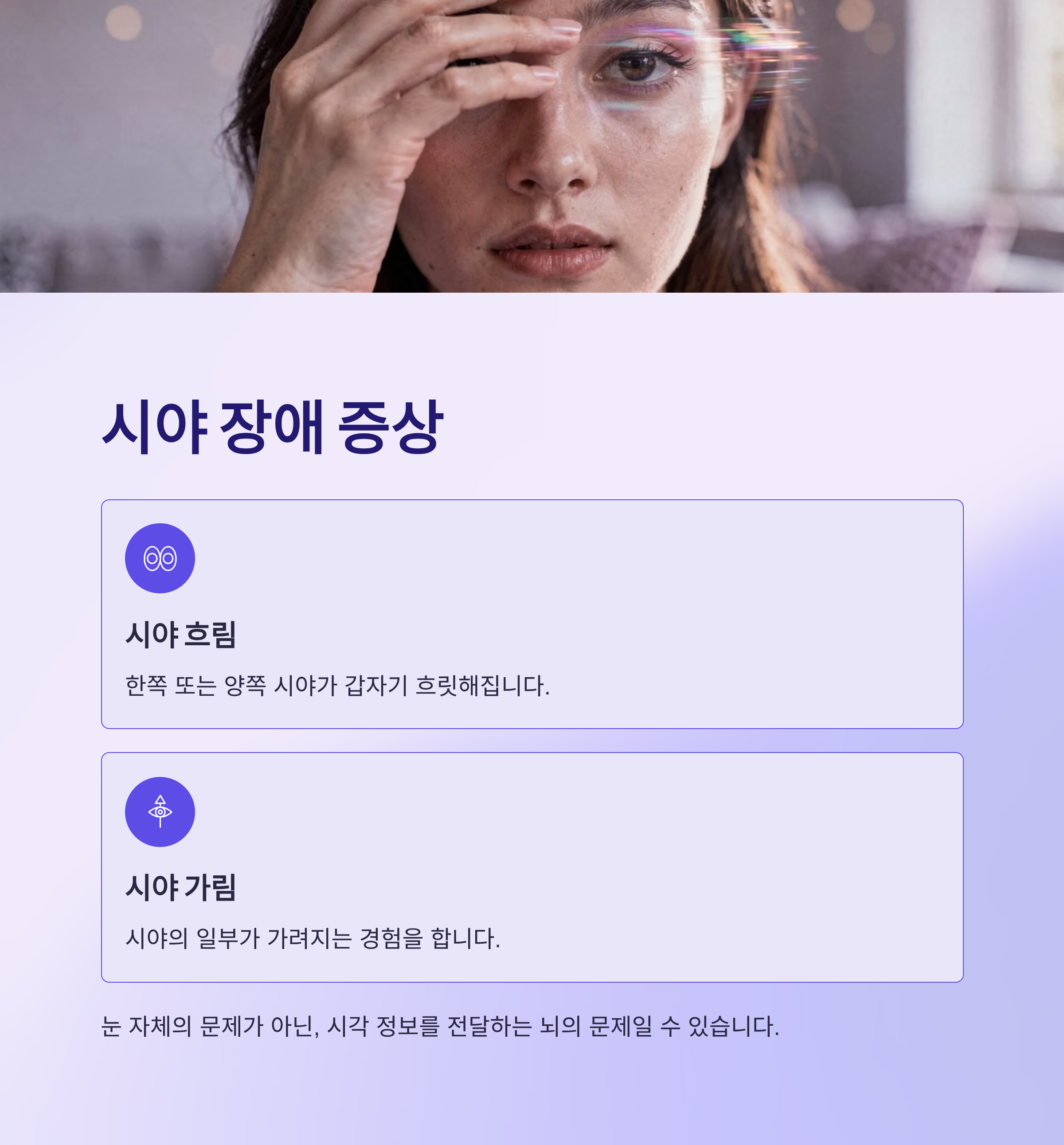 한쪽 또는 양쪽 시야가 갑자기 흐릿해지거나, 시야의 일부가 가려지는 경험을 했다면 뇌졸중 위험과 연관될 수 있습니다. 눈 자체의 문제가 아닌, 시각 정보를 전달하는 뇌의 문제일 수 있기 때문입니다.