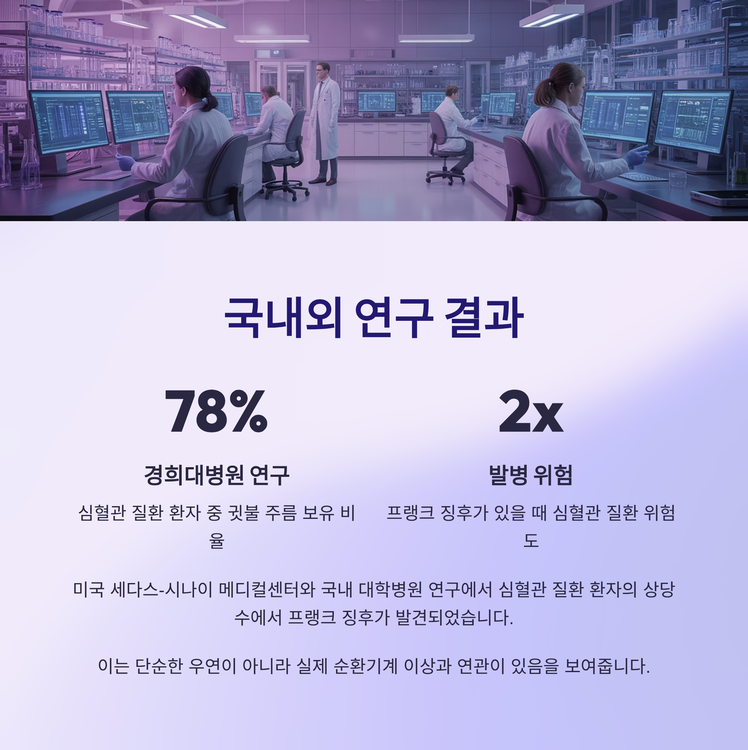 미국 세다스-시나이 메디컬센터와 국내의 여러 대학병원 연구에 따르면, 심혈관 질환을 진단받은 환자의 상당수에서 프랭크 징후가 발견되었다는 보고가 있습니다. 예를 들어, 경희대병원의 한 연구에서는 환자의 약 78%가 귓불에 주름을 가지고 있었다고 보고했습니다.