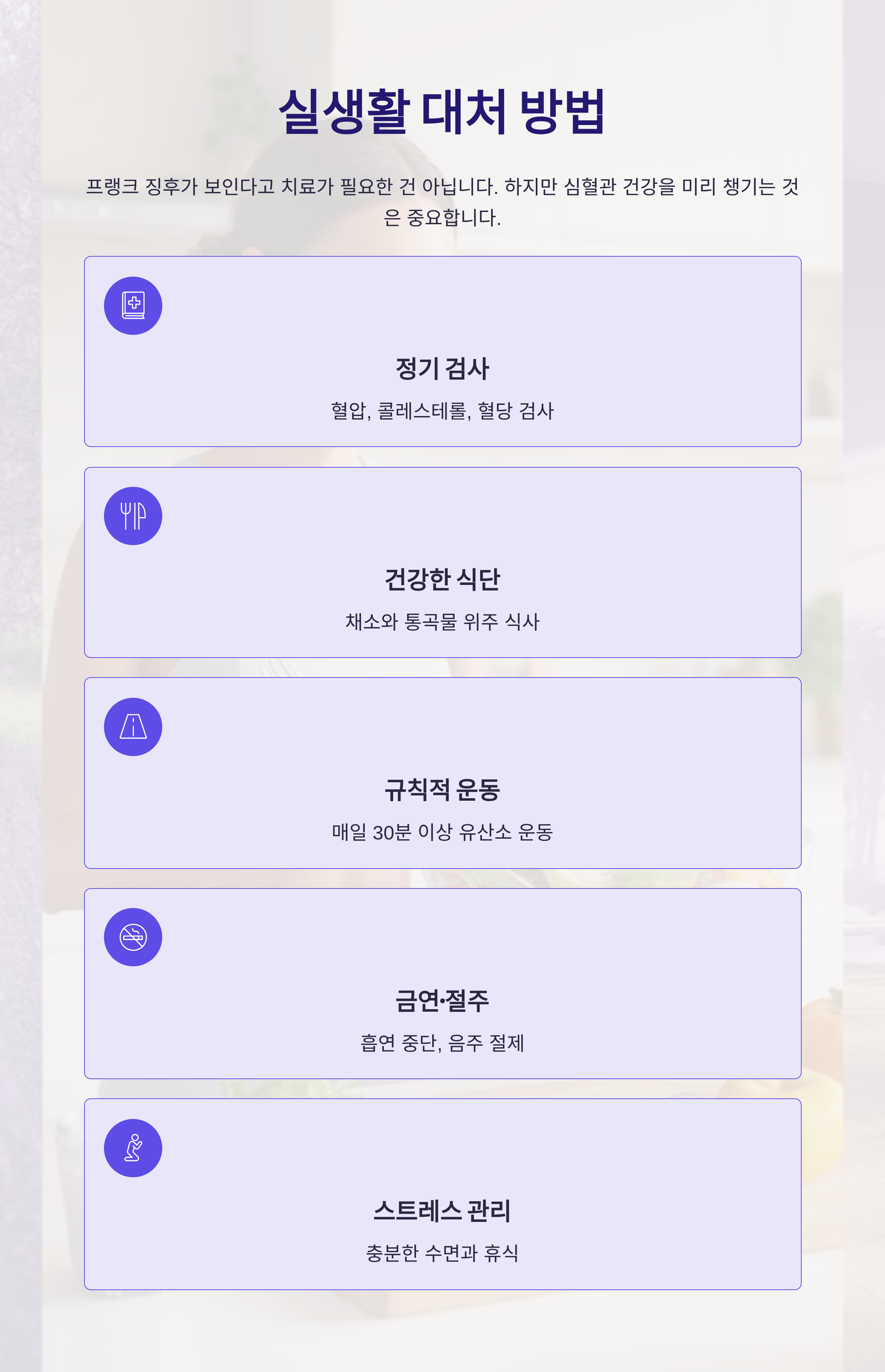 프랭크 징후가 보인다고 해서 치료를 해야 하는 건 아닙니다. 하지만 심혈관 건강을 미리 챙기는 것은 누구에게나 필요한 일이죠. 아래 방법들을 실천해보세요.