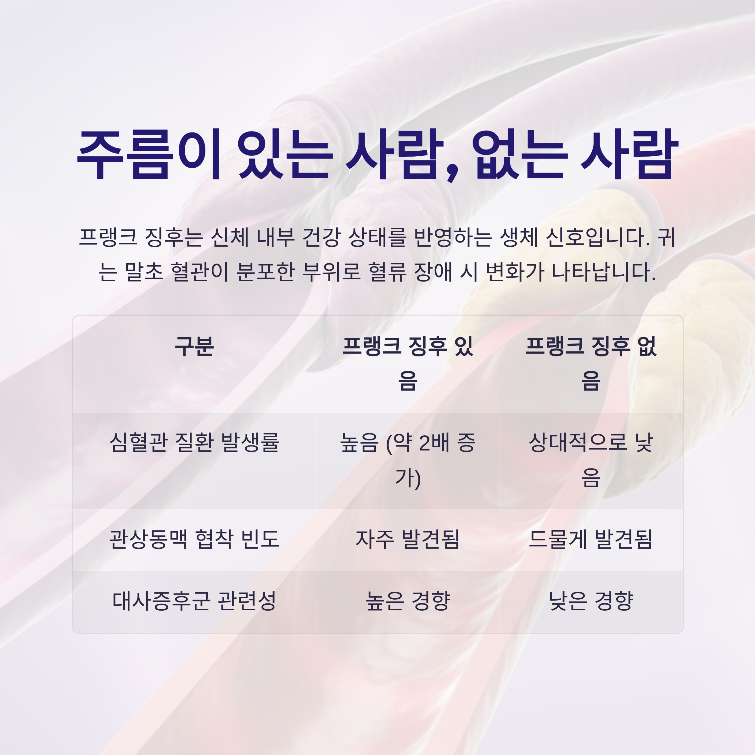 이러한 연구 결과들은 프랭크 징후가 단순히 우연이 아니라, 실제로 순환기계 이상과 연관이 있을 수 있음을 보여줍니다.