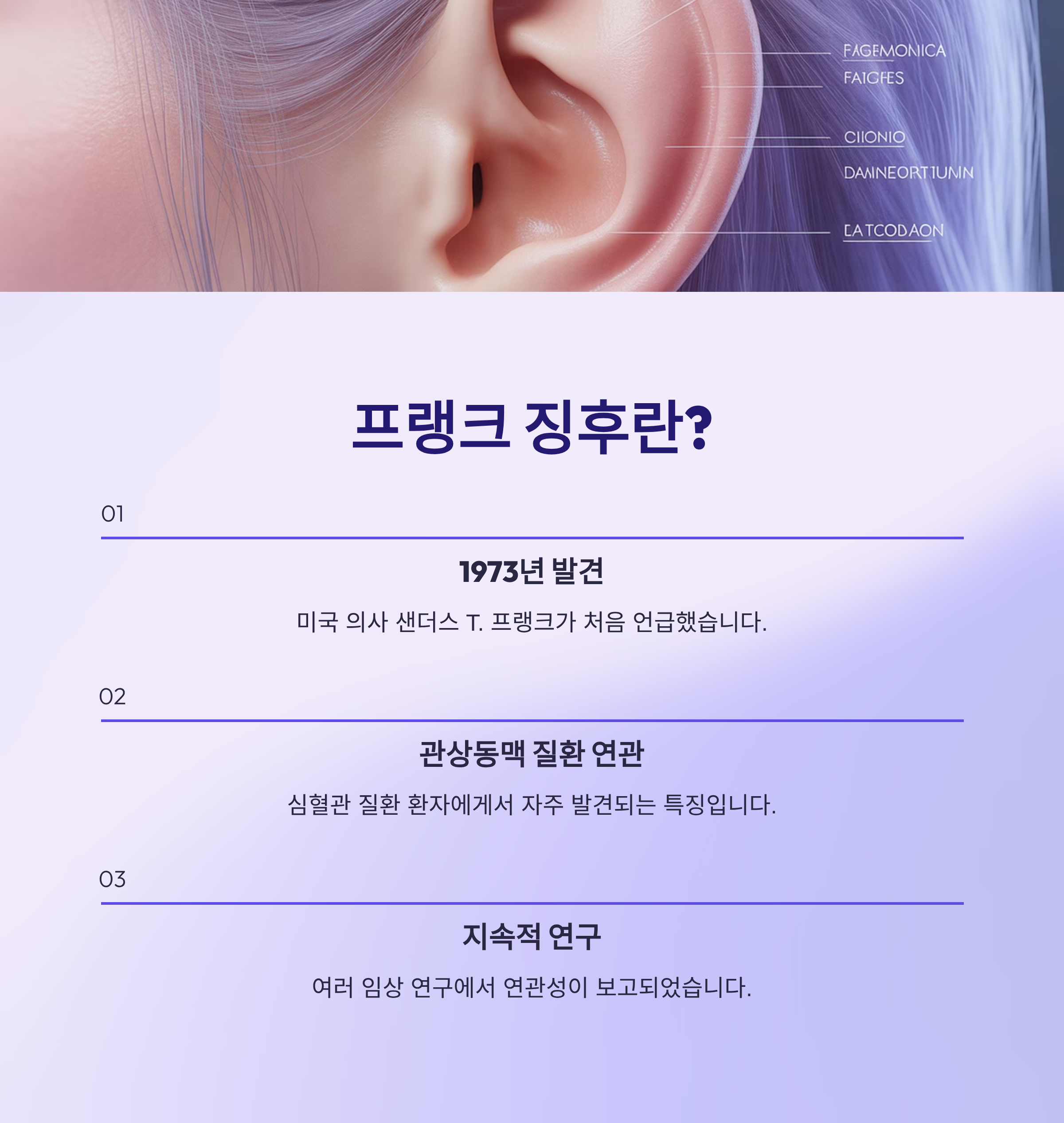귀에 생긴 작은 대각선 주름 하나가 단순한 노화 현상이 아니라, 심혈관 질환의 가능성을 나타내는 신호일 수 있다는 이야기를 들어보셨나요? 바로 '프랭크 징후(Frank's sign)'에 관한 이야기입니다. 이번 글에서는 이 귓불 주름과 관련된 다양한 연구 결과를 바탕으로, 어떤 건강 신호가 숨어 있을 수 있는지 알아보고, 우리가 어떤 대처를 할 수 있을지 정리해보았습니다.