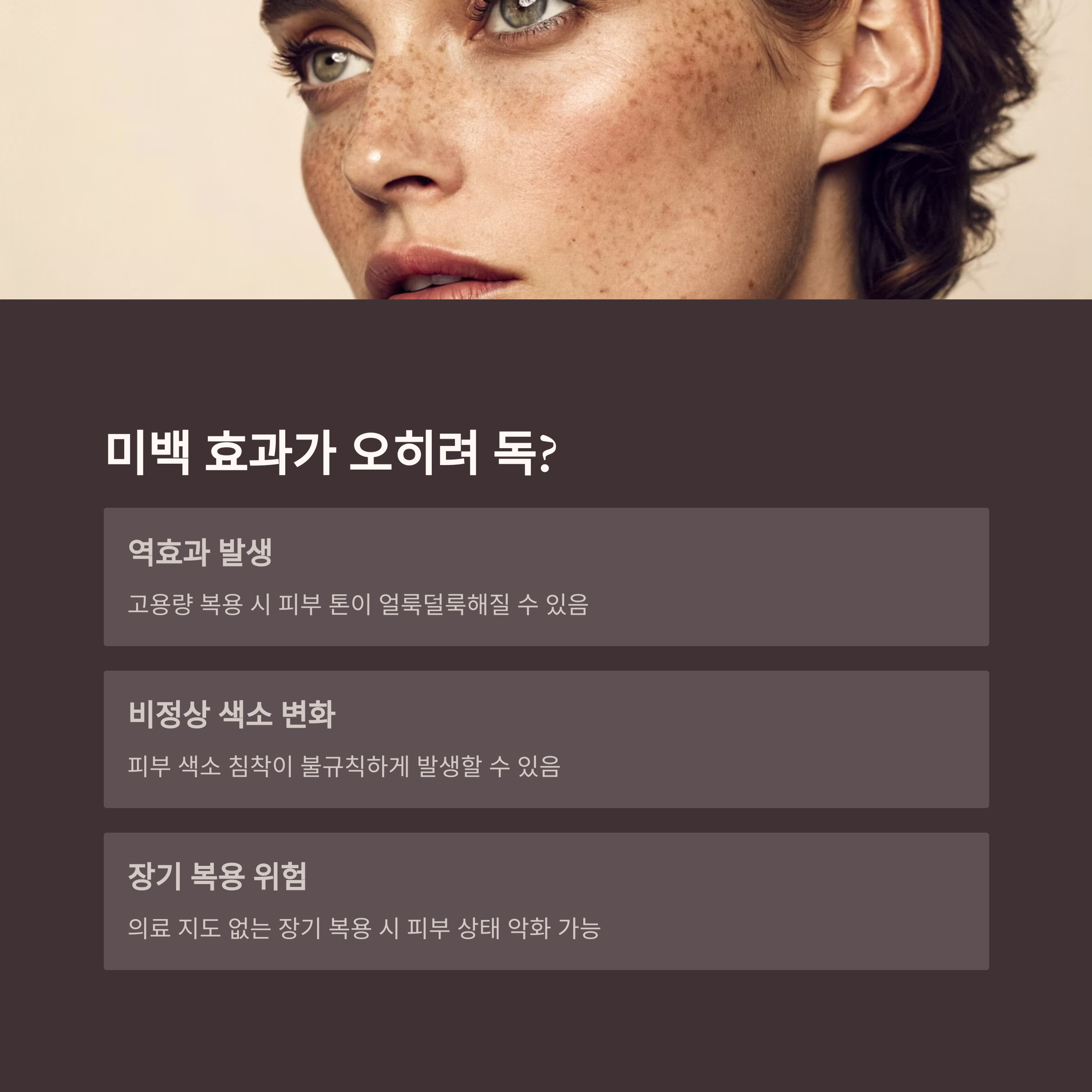피부 톤이 얼룩덜룩해지거나 비정상적인 색소 변화가 보고되고 있으며, 특히 의료 지도 없이 장기 복용하는 경우 위험이 커집니다.