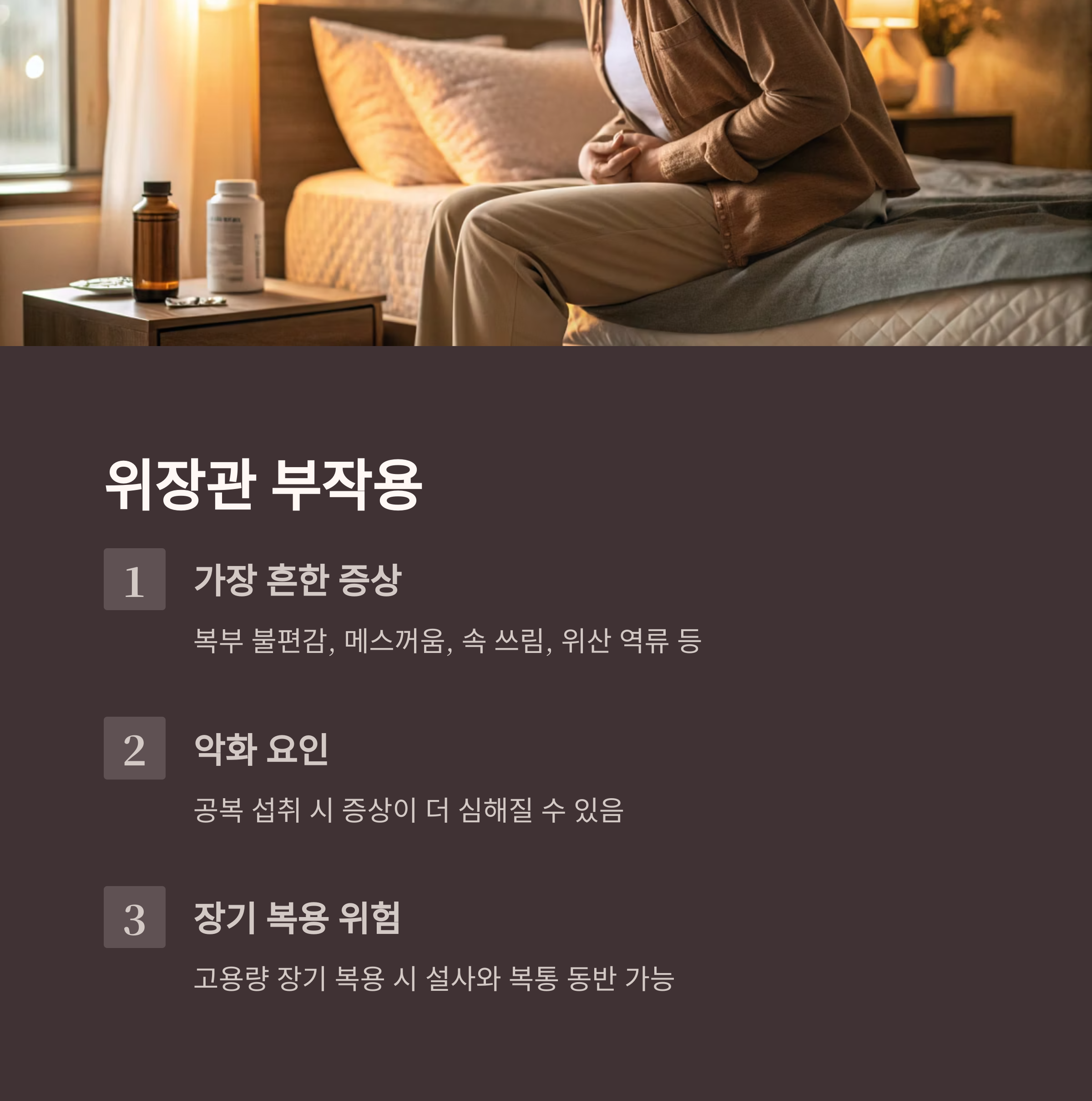 복부 불편감, 메스꺼움, 속 쓰림, 위산 역류 등이 흔하며 공복 섭취 시 악화될 수 있습니다.