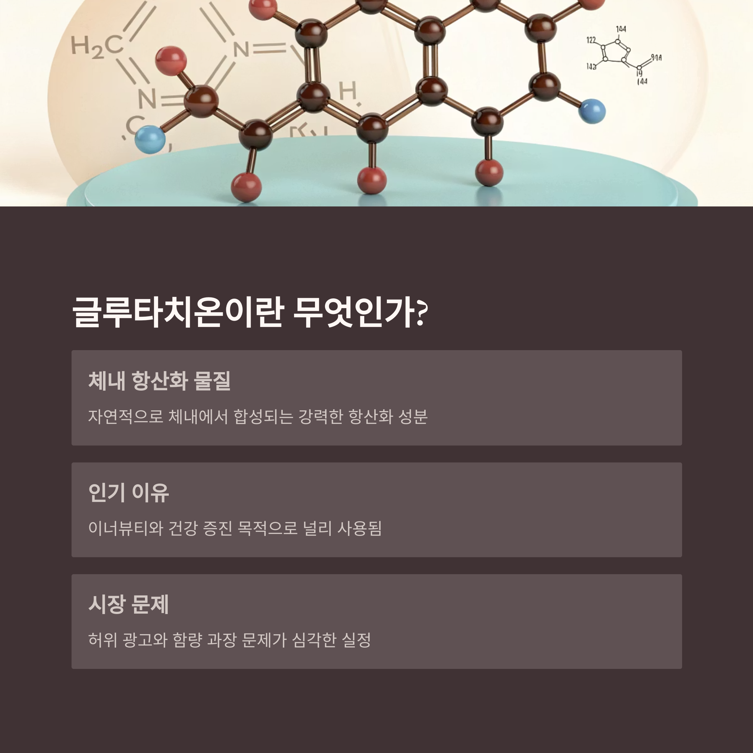 글루타치온은 체내 합성되는 항산화 물질로, 이너뷰티와 건강 목적으로 인기가 높습니다. 그러나 최근 소비자 조사와 실제 사례에서 부작용이 속속 보고되고 있으며, 일부 제품은 허위 광고와 함량 과장 문제가 심각합니다. 본문에서는 글루타치온 복용 시 주의할 부작용과 시장의 실태를 구체적으로 다룹니다.