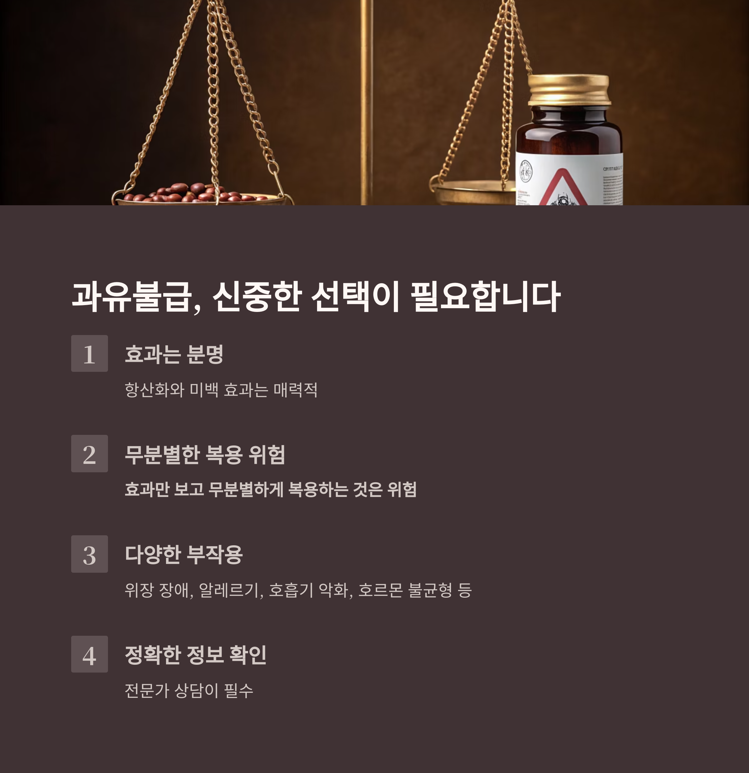 위장 장애, 피부 알레르기, 호흡기 악화, 호르몬 불균형, 피부색 변화 등 다양한 부작용 가능성을 반드시 염두에 두어야 합니다.